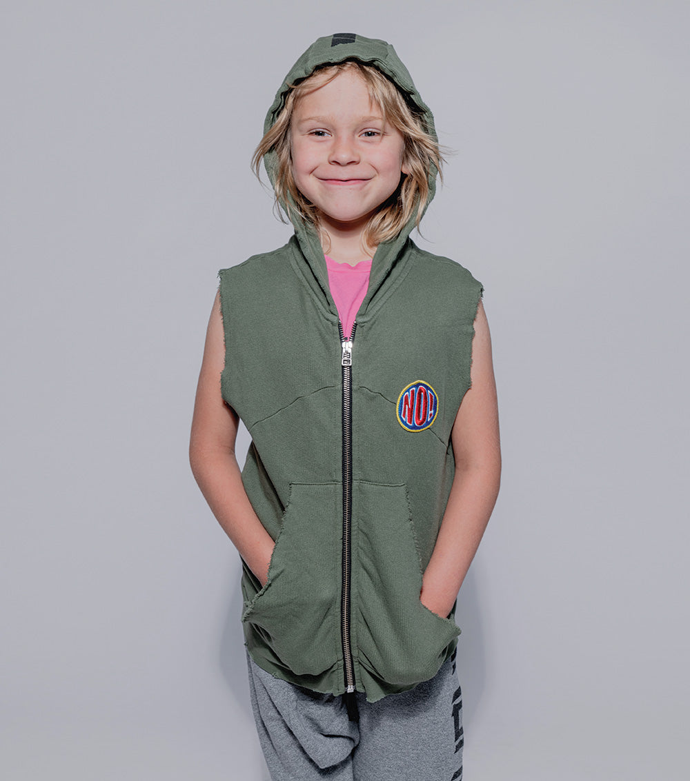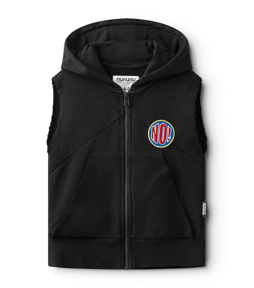 the most amazing layering piece for summer and beyond. this black vest punks up any tee, tank, swimsuit or dress with its raw edges & slouchy cut. zip it up & keep it tight, or leave it open like you just don’t care. the oversized hood has a stripe down the back, and a kid’s favorite protestation comes on a colorful patch at the chest. (that would be a “no!”)