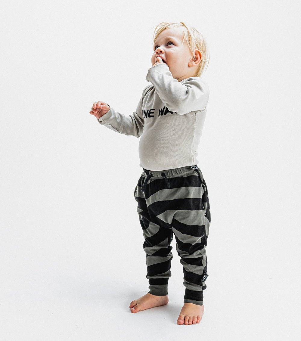 check out these super cool graphite baggy pants for baby boys & girls with our sick road web print. the look is fitting because you know your baby will be making their own way in these pants. they’re made with super high-quality fine rib fabric so they’re literally so cozy, like a constant hug. they’re roomy & slouchy, giving them room to kick & squirm and explore what it feels like to have legs. good thing they go on & come off easily with an elastic drawstring waistband which keeps ‘em snug and wide lower cuffs that keep 'em up. complete with slanted pockets to stash all their little secrets.