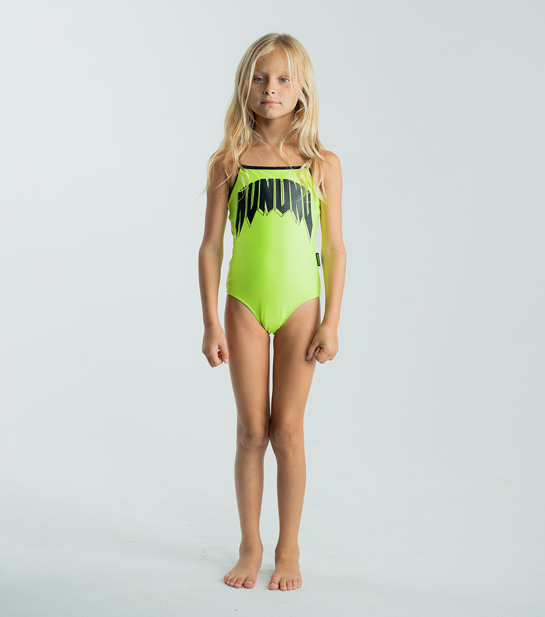 this “hot lime” one-piece girls swimsuit comes in an electrifying neon green that is totally ‘80s in the most modern way. a nice, classic cut with a square neckline, low-cut legs & adjustable straps, it has our new “rawk” logo design really big on the front, like an album cover. throw up some metal & get back to the days of real music with a poolside look that can double as a top with jeans & shorts all summer long.