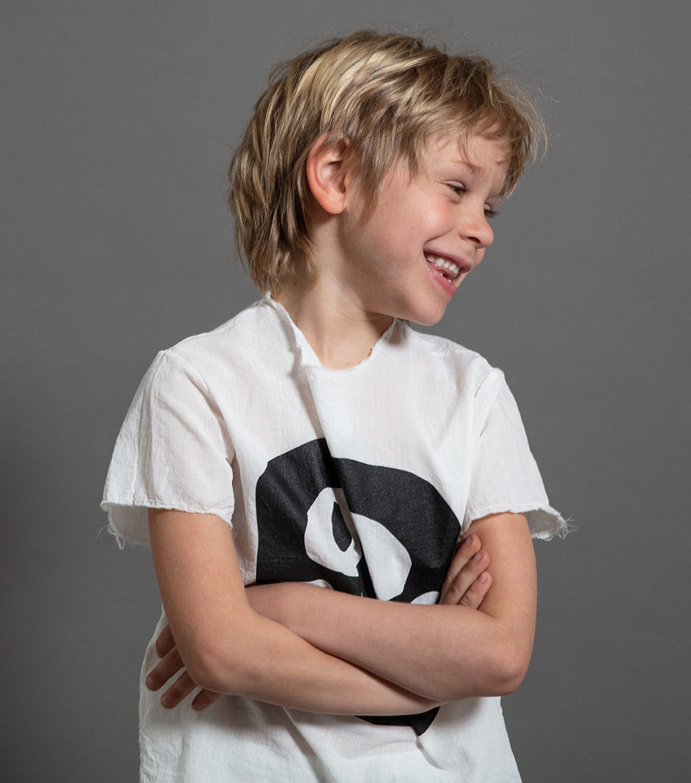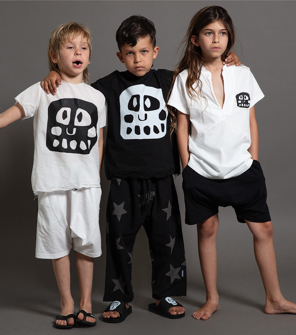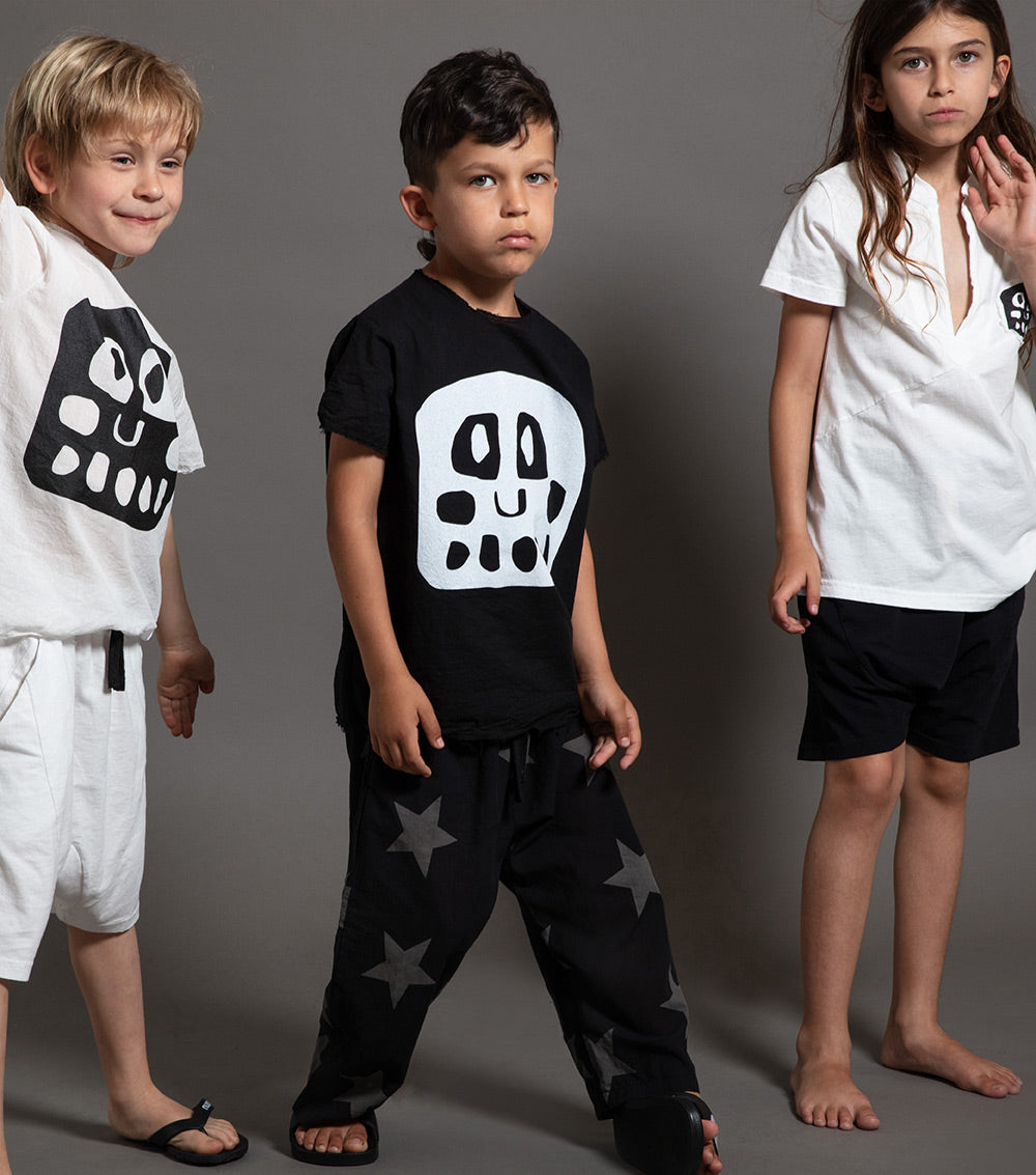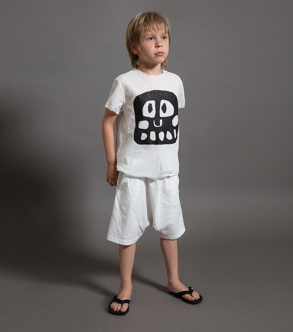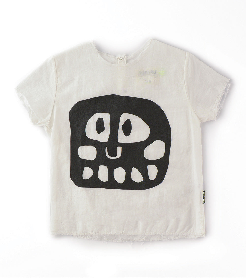too cool for school—more like vacay vibes. this light-as-air cotton voile short sleeve beach shirt comes in soft white with our black rowdy mask graphic on the front. the design is a collaboration with artist Shay Id Alony, and an evolution of our beloved tribal mask motif. it has a back snap for closure all around.