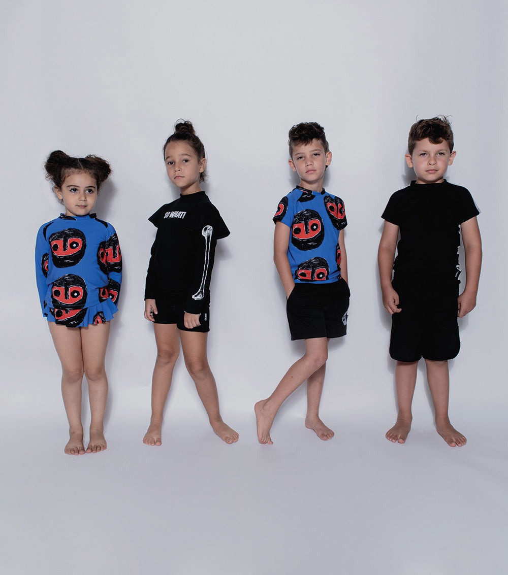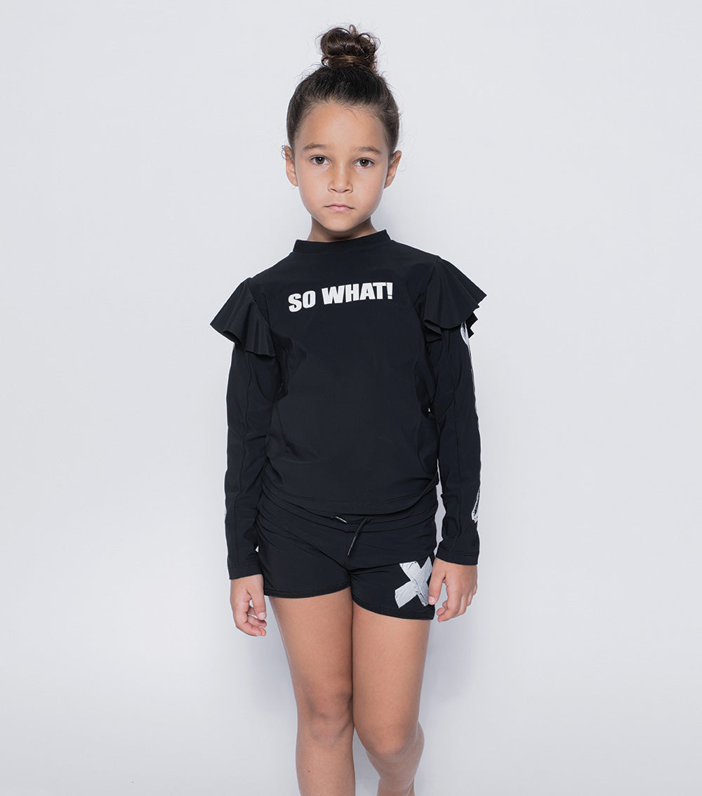 a black long-sleeve rashguard is the cool kid’s beach basic, and this one definitely takes it up a notch. ruffles flutter from the shoulders, with big bones running down the arms. the words “so what!” come nice & big in white on the front. always a good look, giving no craps whatsoever. miles davis would approve.