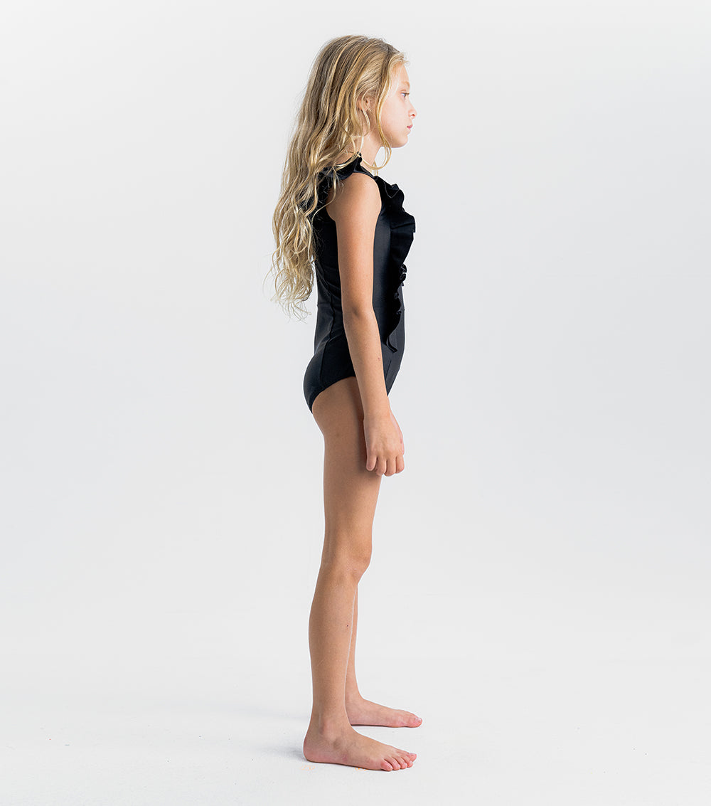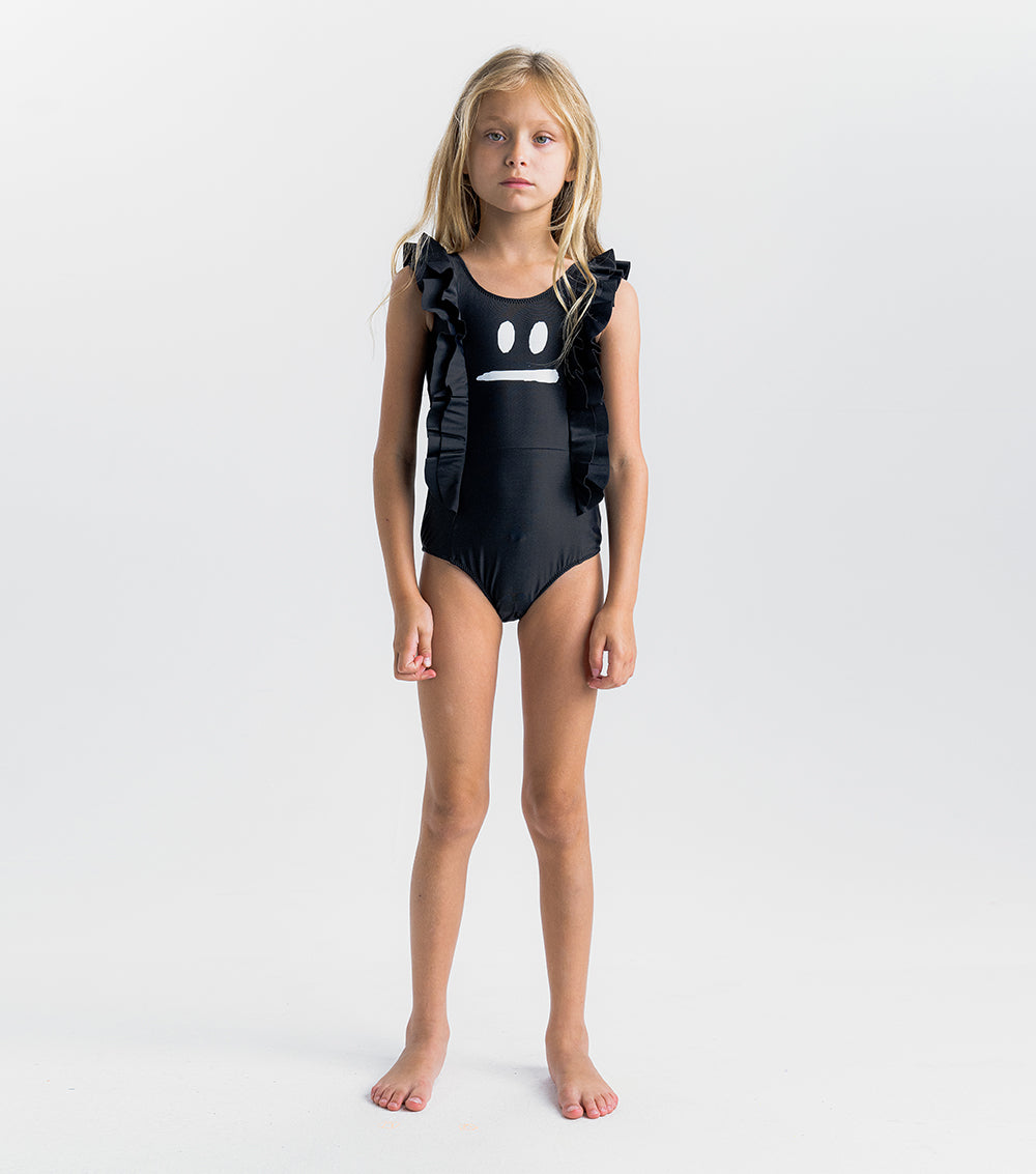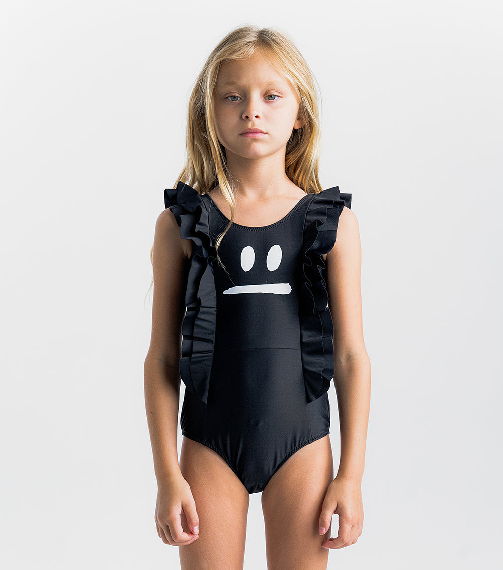 get ready for your kid to transform into the most badass mer-kid on the vacay when they try on this black one piece. it’s giving gothic sunset vibes with black panels on the sides at the bottom for some cool kid contrast. of course, we love the mischievous little face printed in black on the front. oh and make no mistake. the black & hot pink ruffles aren't meant to be cute. they’re like beautiful gills on this smirky little fish.