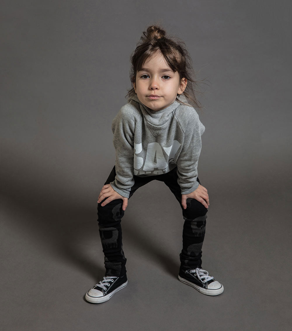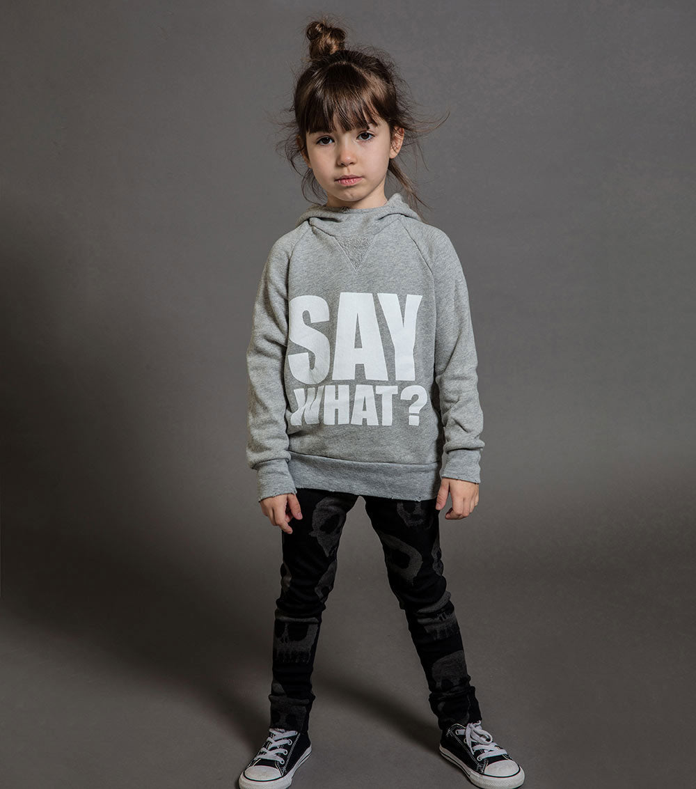 hoodies are our thing, did you know? we call this the fluffy version because the fabric is actually cloud-level cozy. the heather grey unisex pullover comes with a smart mouth saying on the front, something we’re used to hearing, like when we ask for a simple favor or room-cleaning. a perfect layering piece for boys or girls, as temperatures begin to dip.