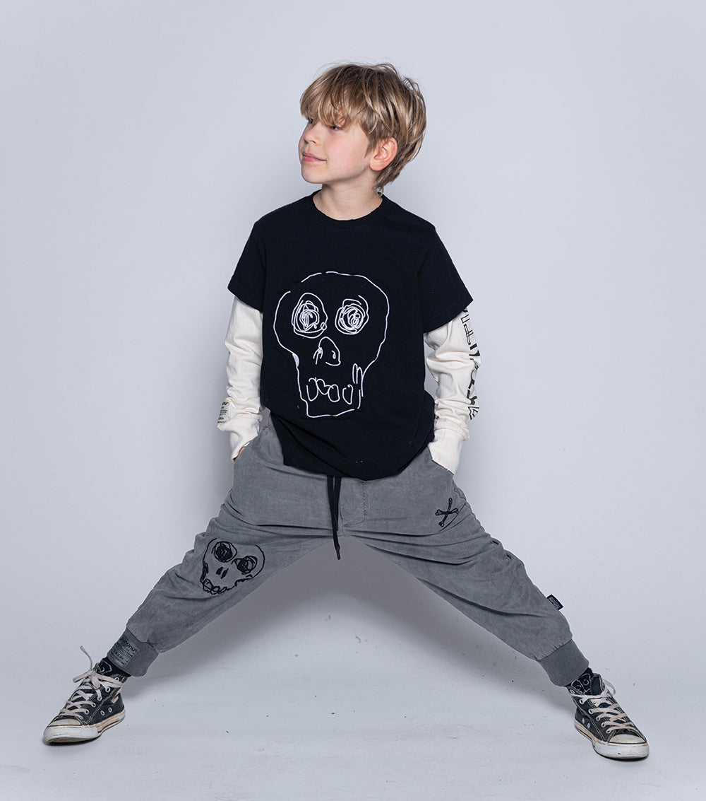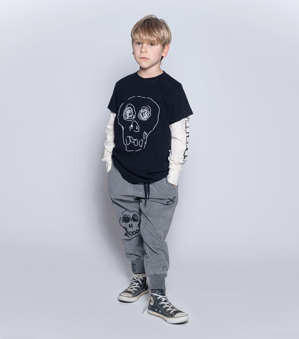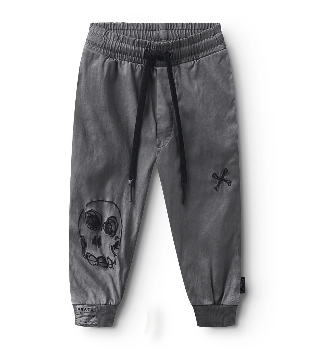 these vintage grey pants bring boys & girls all kinds of symbols & signs of the times. made of thickish and fluffy cotton for a good strong structure, they have side pockets & well-placed winter motifs like the dazed skull and crossbones both embroidered and add major twist. elastic cuffs and waist keep them criminally comfy and the care tag is sewn cleverly on the outside, placed down on the cuff, because we don’t do things like everyone else.