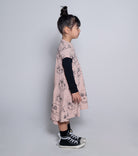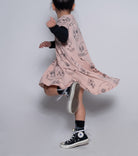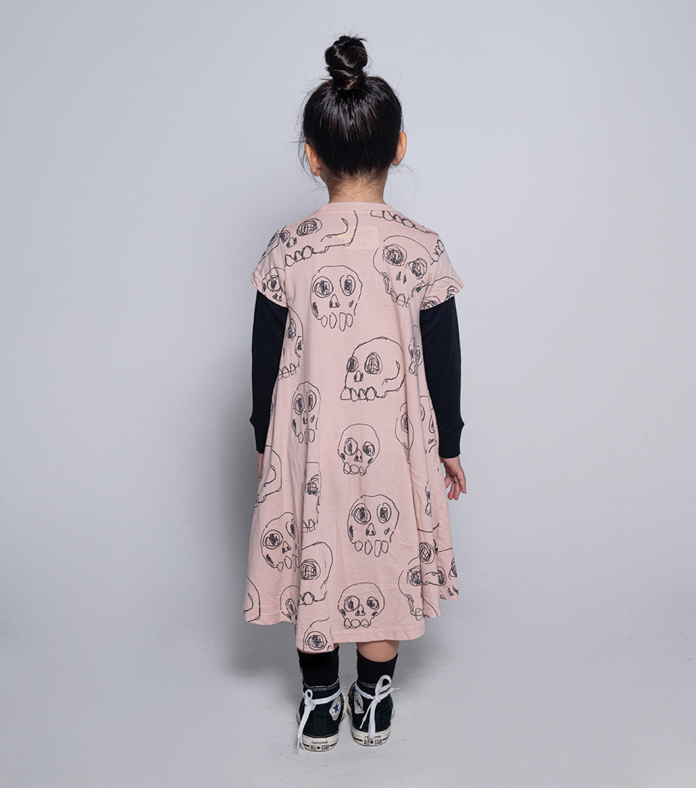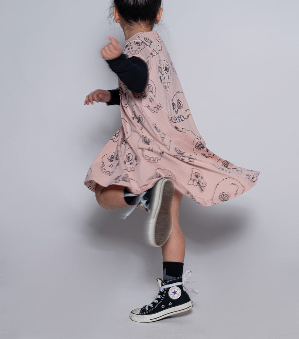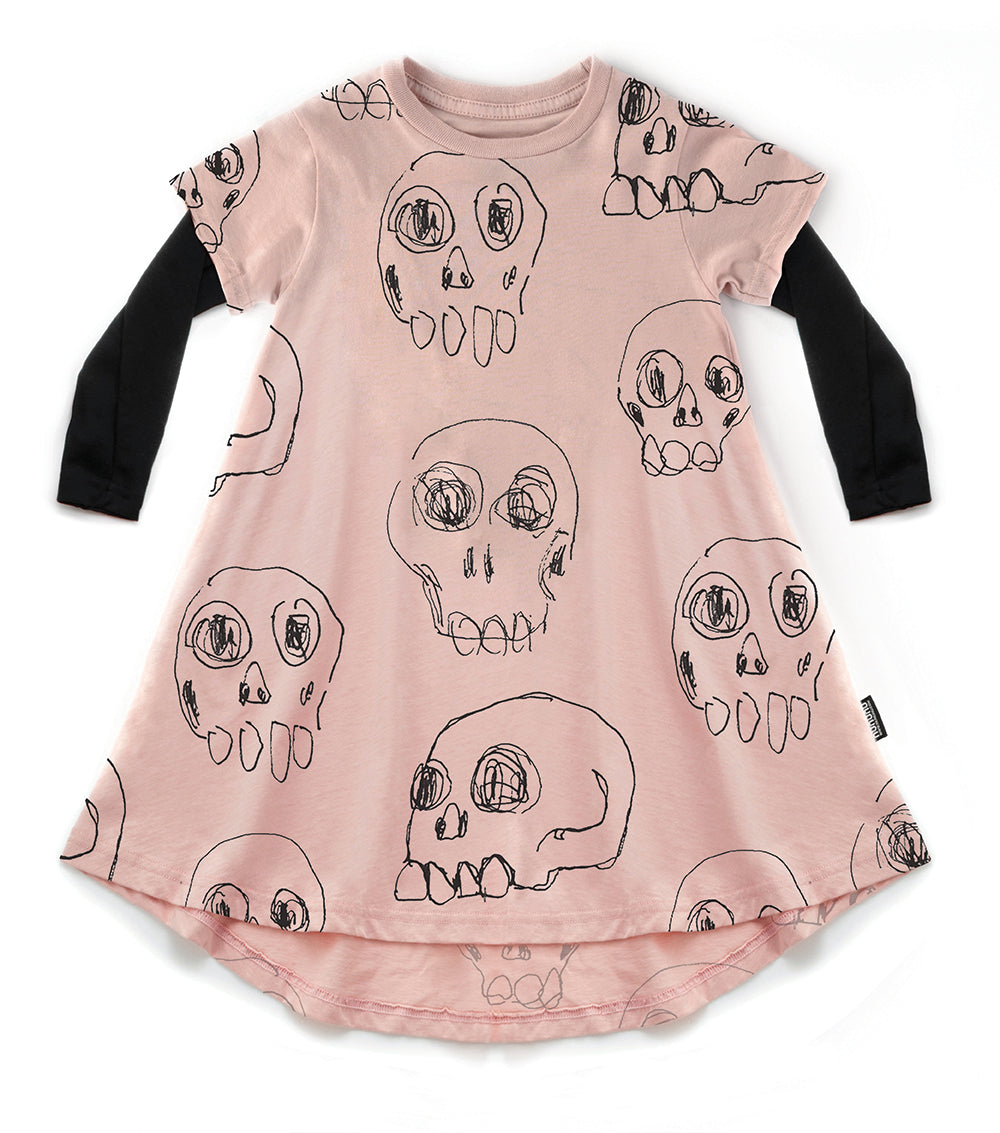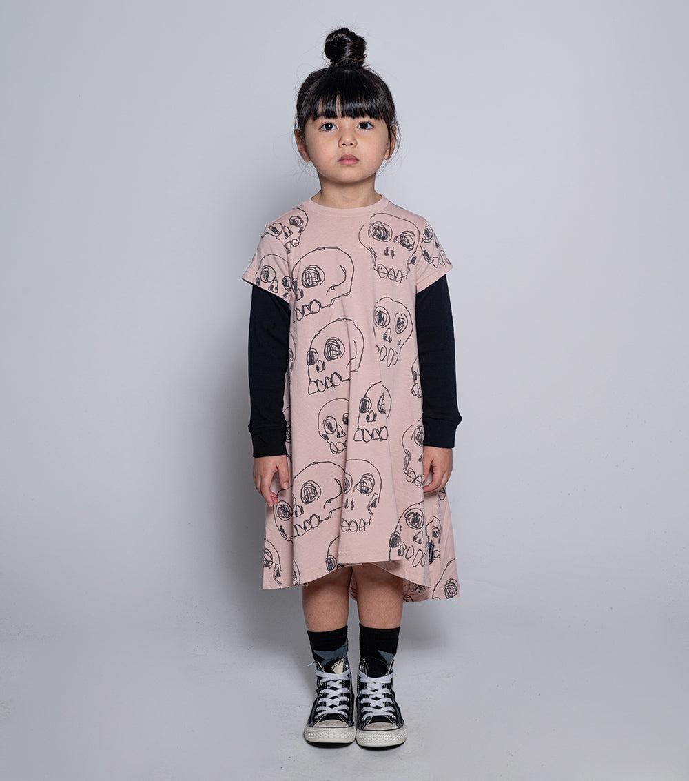 the classic nununu 360° dress is updated with our scribble skull print, a collaboration with artist Shay Id Alony. it floats all over this amazing powder pink dress. it creates this cool visual effect when you twirl around, which is the whole point of this dress, basically. long black sleeves give it that grunge layered look we love so much.