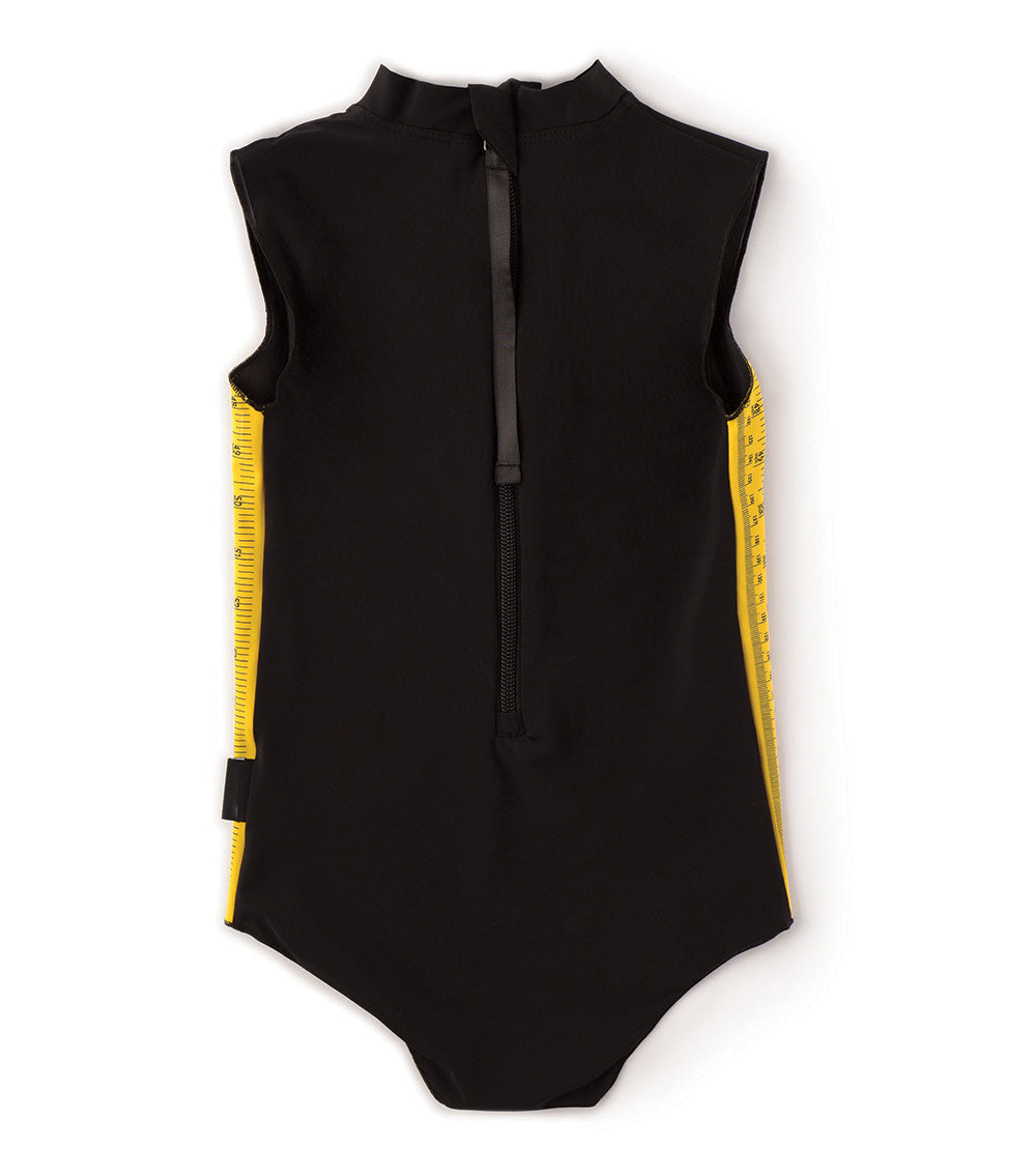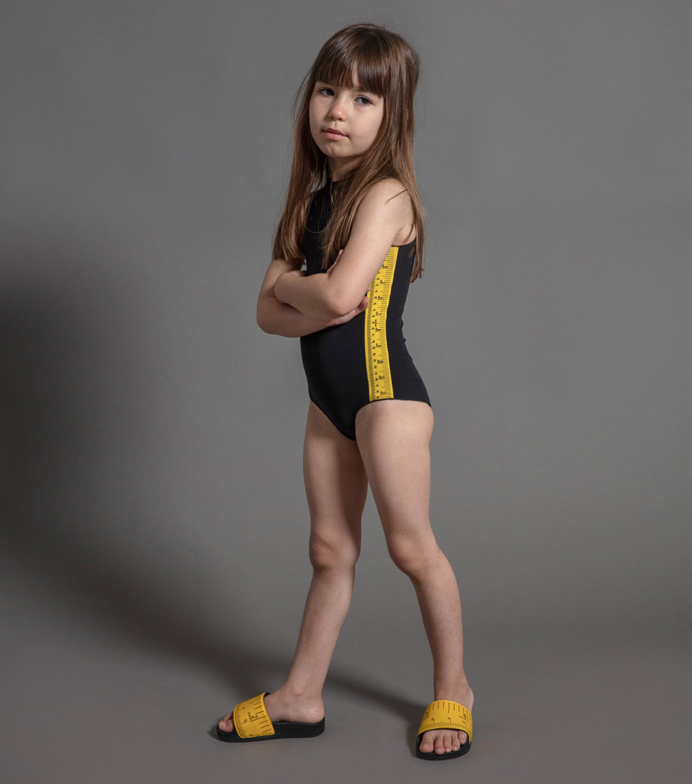 we’re getting back to fashion basics with this dope measuring-band motif, seen here up and down the sides of this black one-piece swimsuit for girls. it zips in front with a high collar like a badass surfer girl’s wetsuit. sleeves are non-existent, so arms are free to swim, splash, dig or cross in front of her chest when she’s having one of her fits.