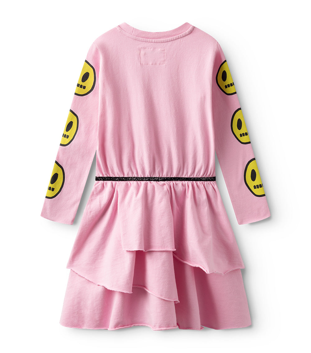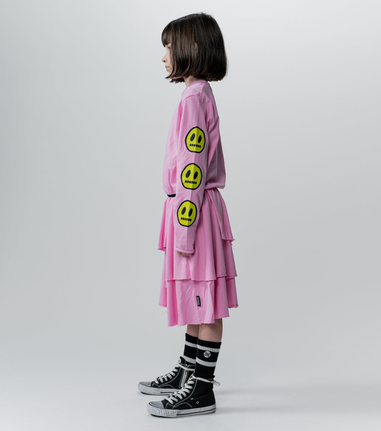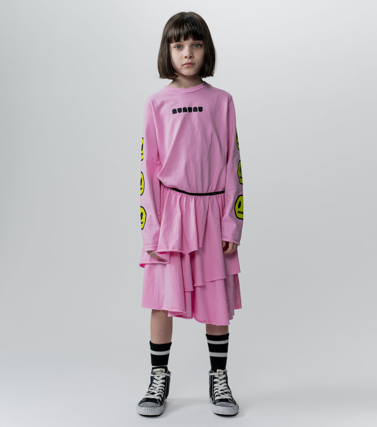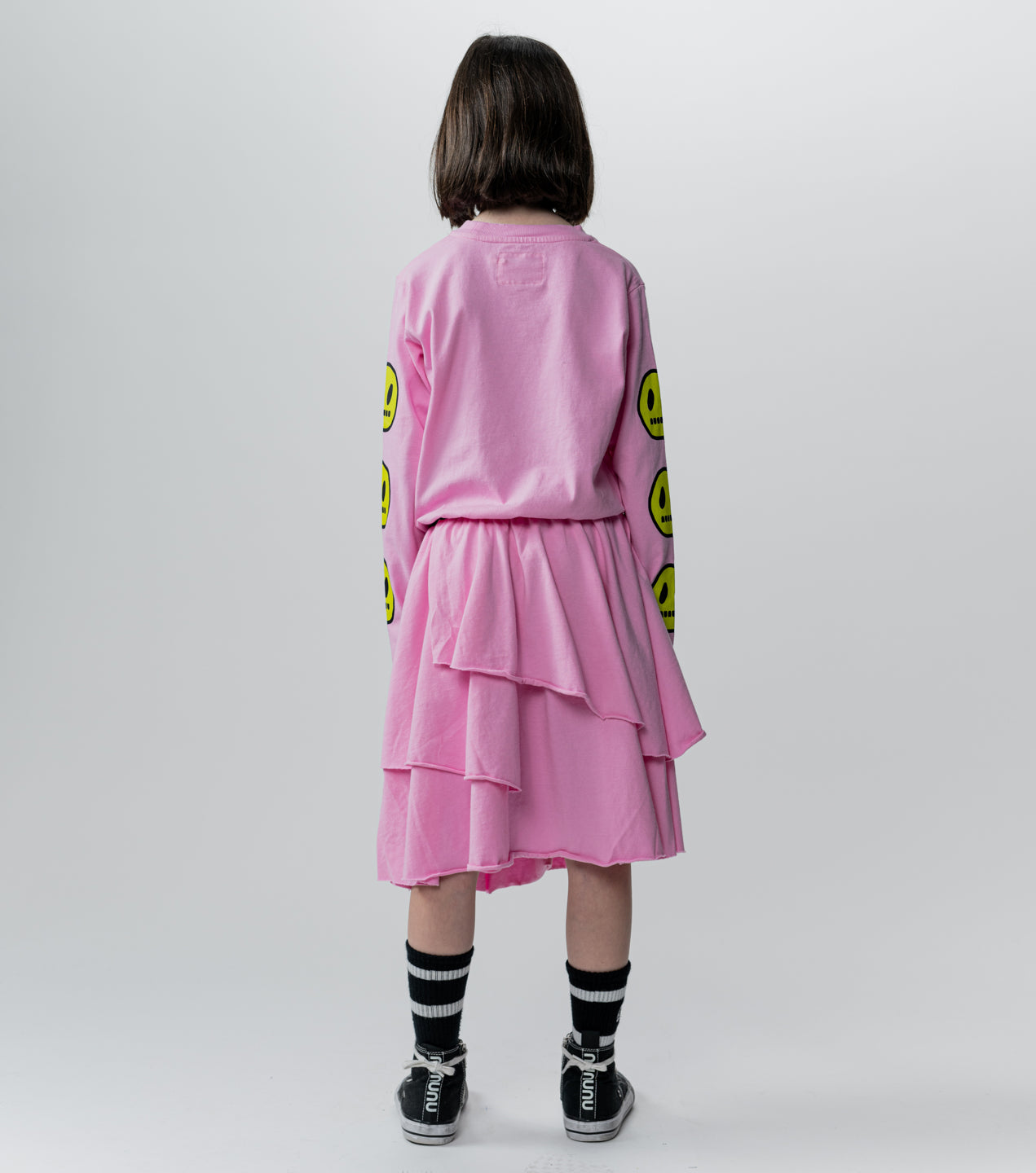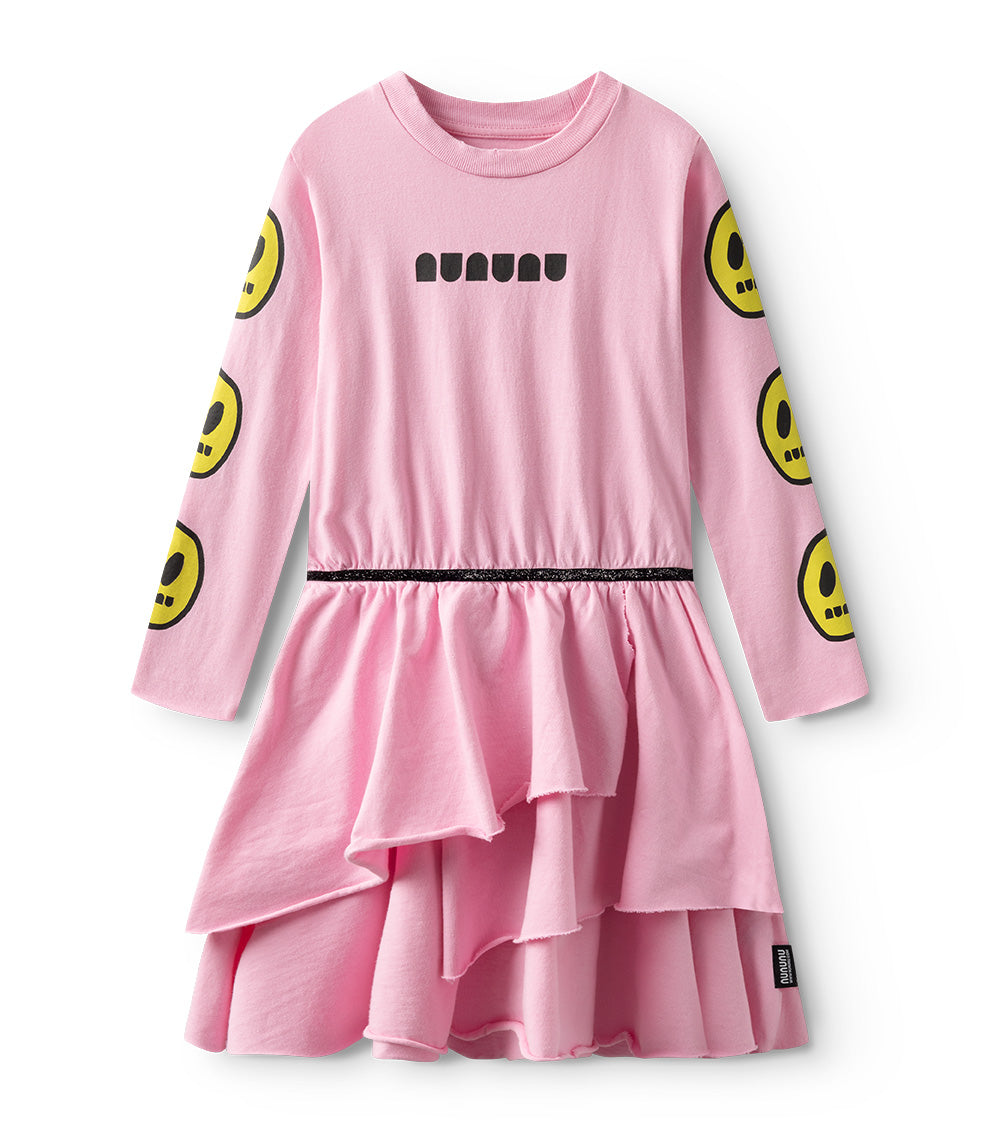 get ready to see a whole lot of smiles because this super pink dress has them all and so will your kid when they wear it. it’s made of heavy single cotton with three bold black & yellow smile prints on each sleeve and our nununu logo looking mysteriously cool on the front. it’s got a totally chic sequin elastic waistband to cinch the totally twirl-worthy spiral layers. pair it with boots to stomp around town or sneakers for dancing all night long.