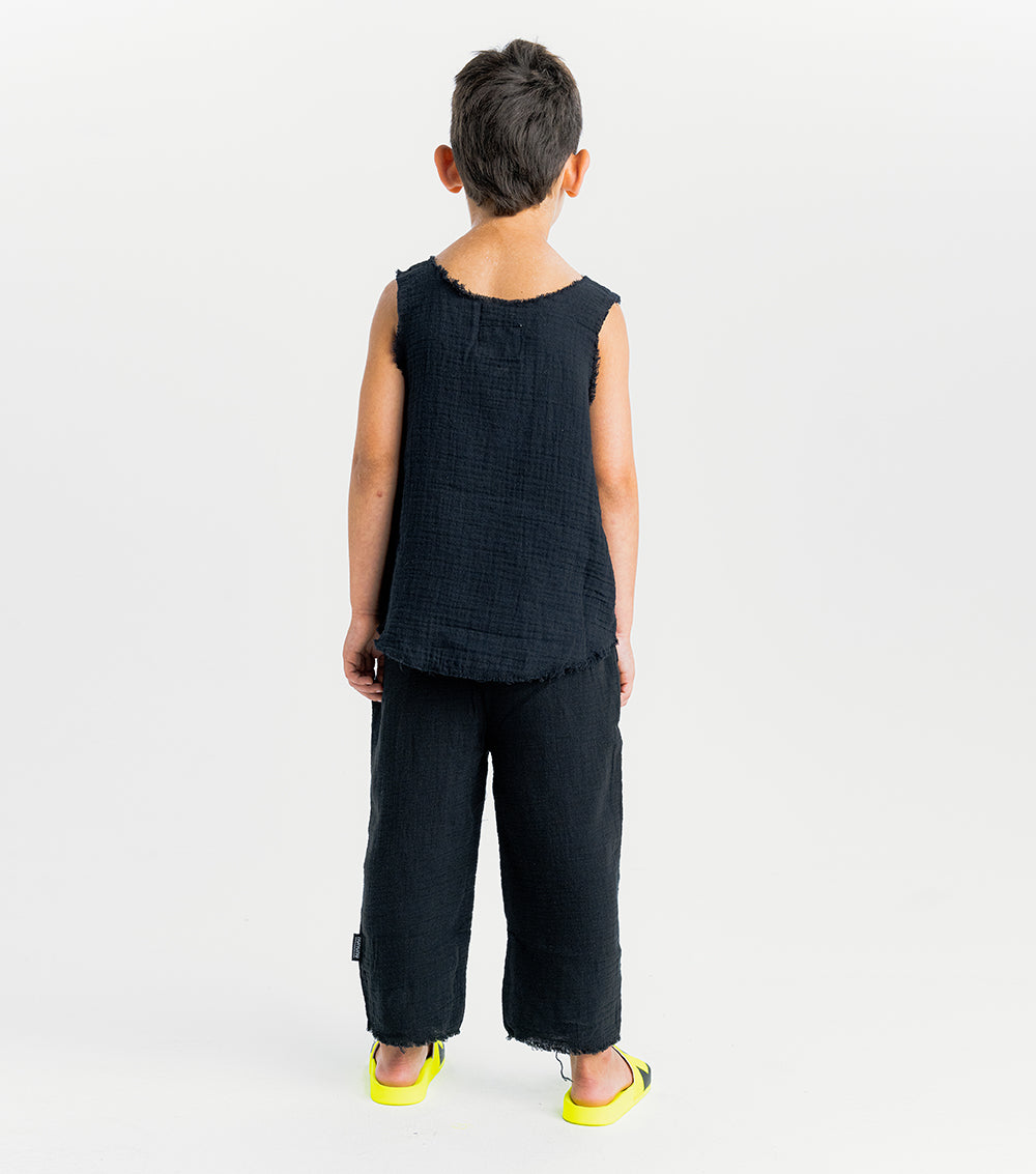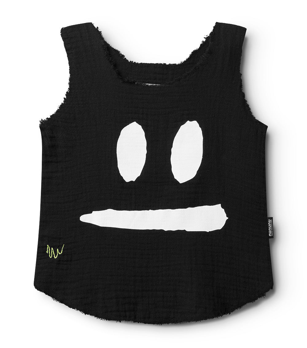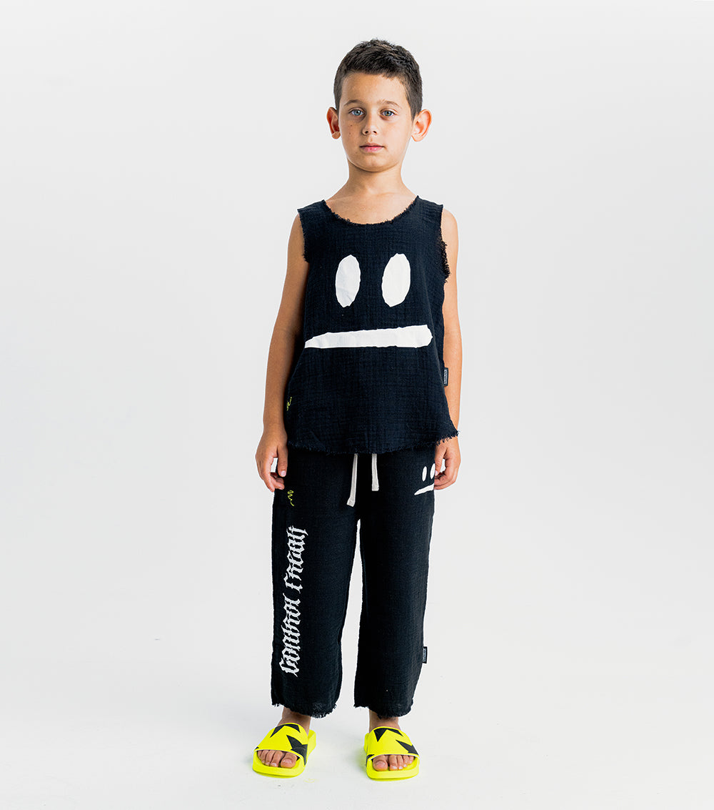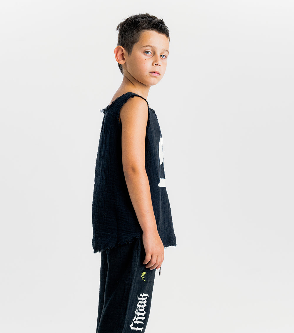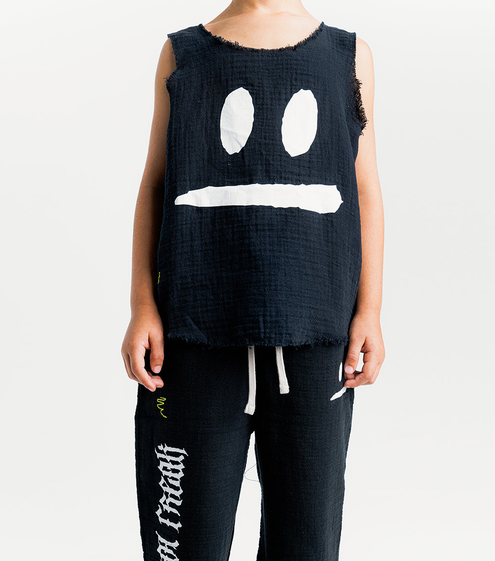 which way is the beach again? show off the directions & those little human biceps in this gender-neutral black muscle tank. it’s made of muslin which is so airy it’s basically like not wearing a shirt at all. to keep it extra cool, it’s got raw edges like the sleeves & bottom were cut off plus they’re sliced in a rounded sort of way that looks a little shorter on the sides. yeah we know it's rad. oh and we’ve got our smirk print in contrasting white so it belts out a warning that this kid loves to make mischief. plus, a sneaky little squiggle is embroidered on the side like this kid is testing out a new marker to do some art. aka kid graffiti.
