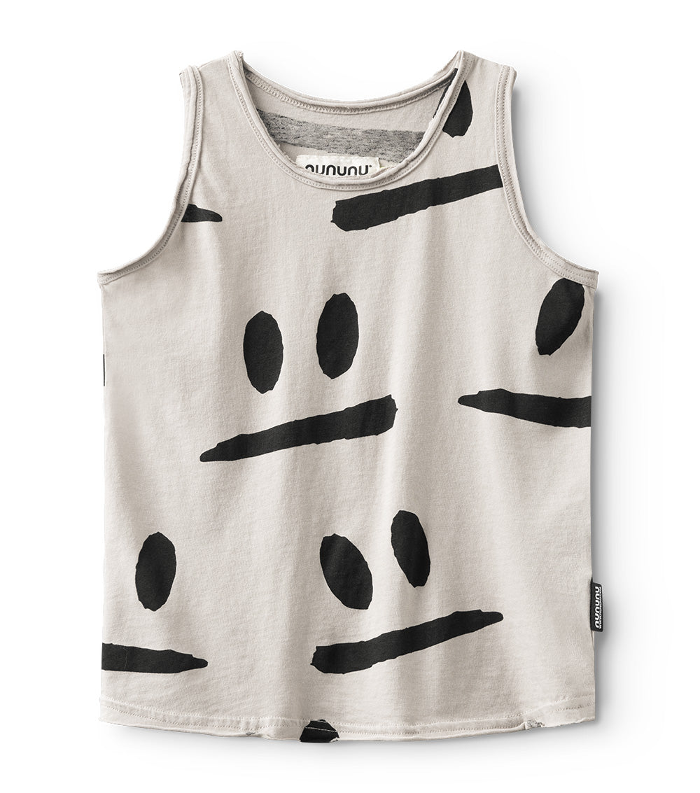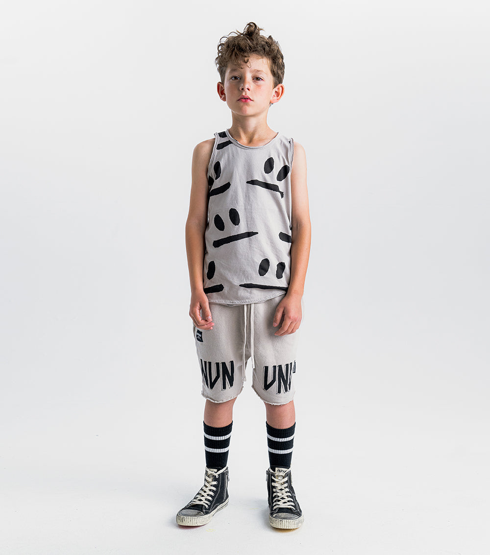 this face says it all. we’re keeping it extra moody with this too cool smokey grey single cotton tank for boys & girls. check out the raw rolled edges that are giving as much attitude as the all over smirk print. wear it to school, the beach, or around town to show the crowds who's the boldest in the bunch.