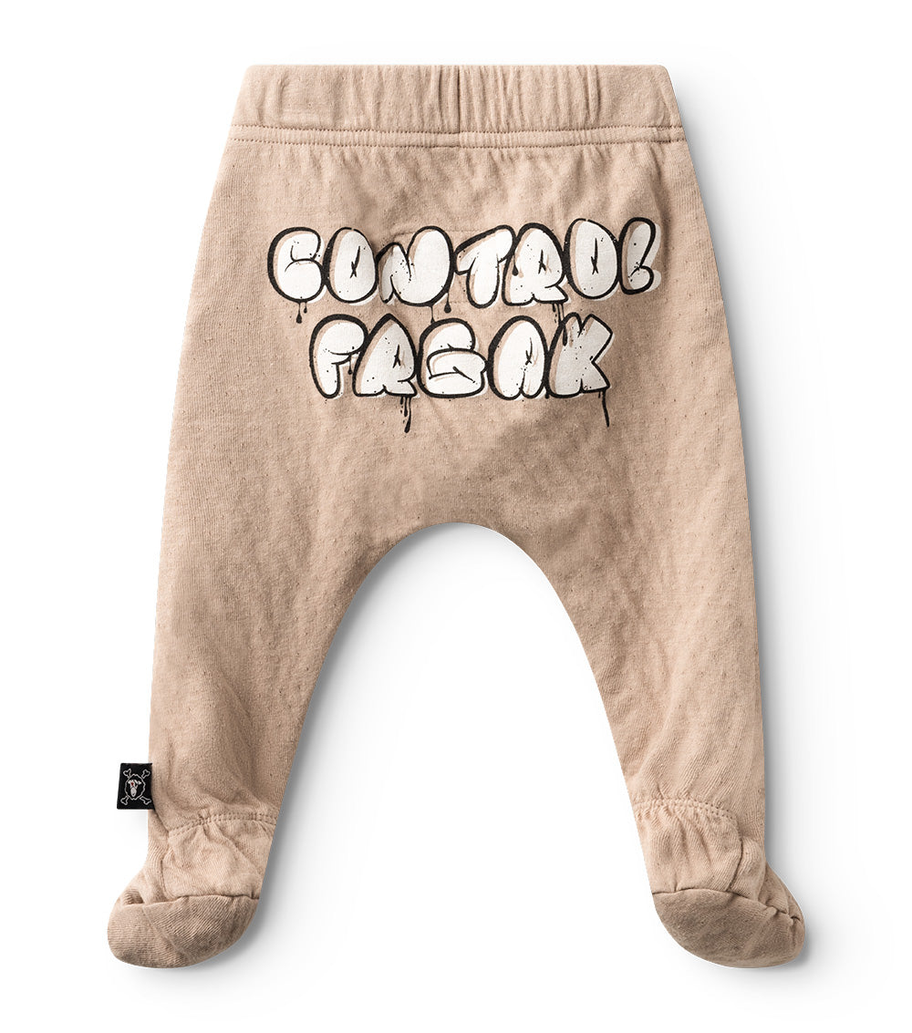 footed pants? yes please. this gender neutral footed baggy fit is made of extra soft coffee double single cotton and has a super comfy cinched elastic waistband with drawstrings & sly little pockets. it’s got plenty of space for diapers & moving around. that means it can take all the crawling your baby pleases, so you can see the big & bold, bubbly writing right on the bum where it says control freak in bubbly drippy letters.