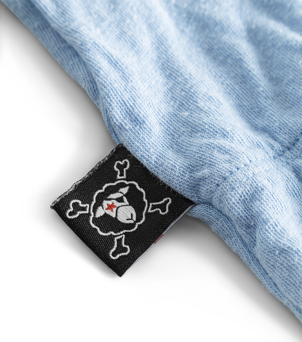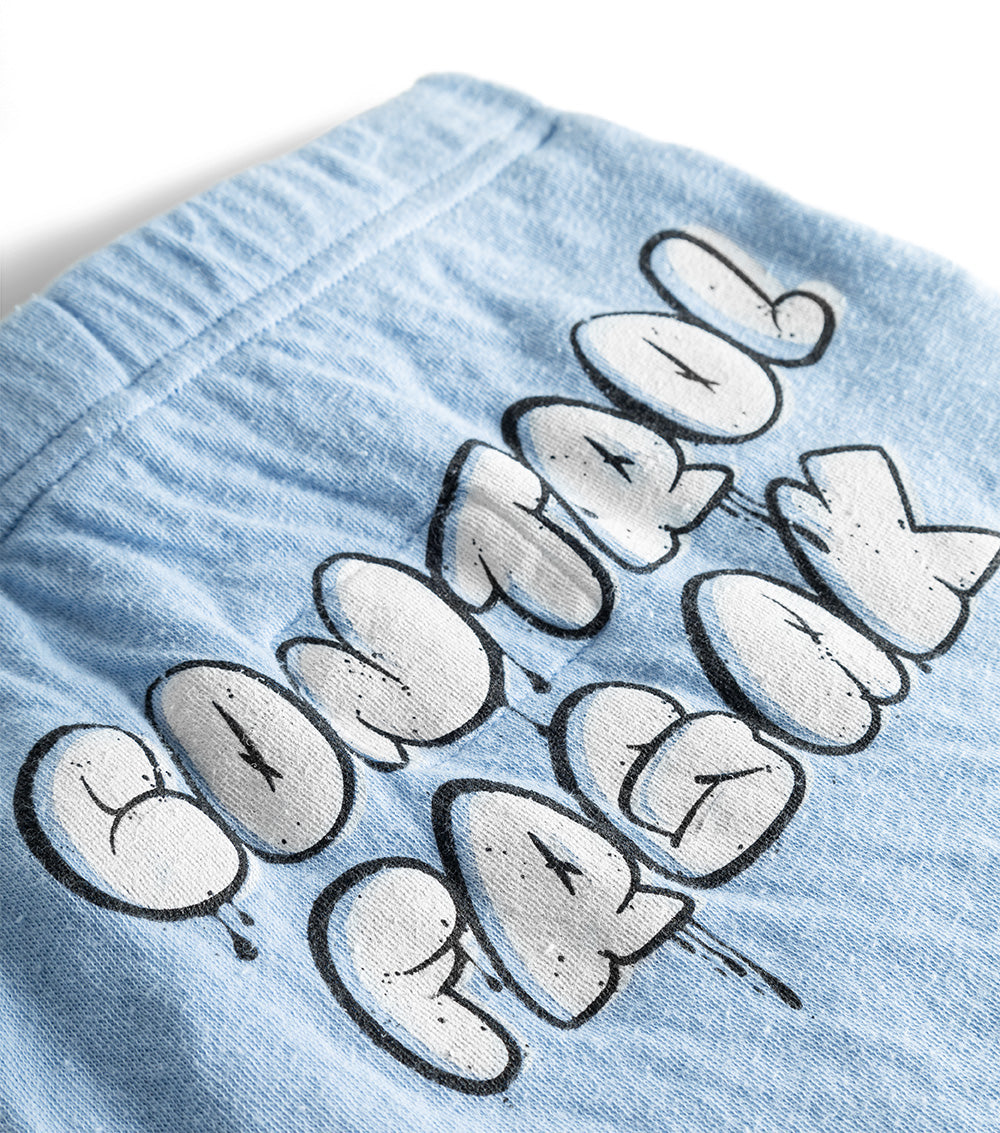 footed pants? yes please. this gender neutral footed baggy fit is made of extra soft foggy blue double single cotton and has a super comfy cinched elastic waistband with drawstrings & sly little pockets. it’s got plenty of space for diapers & moving around. that means it can take all the crawling your baby pleases, so you can see the big & bold, bubbly writing right on the bum where it says control freak in bubbly drippy letters.