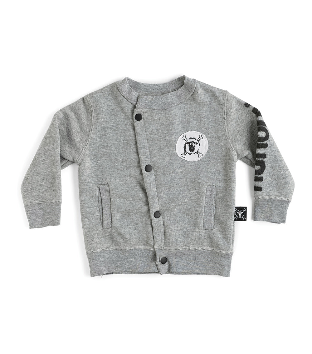 a grey cardigan is a good mini-adult look for a baby, but ours isn’t too buttoned up. it’s soft & cozy french terry, like a sweatshirt, and it’s got this dope asymmetrical snap closure, for easy removal when things heat up. our logo is spray-stenciled on the sleeve, and this fashionable look is finished with our tiny blacksheep patch at the chest—an omen of what’s to come?
