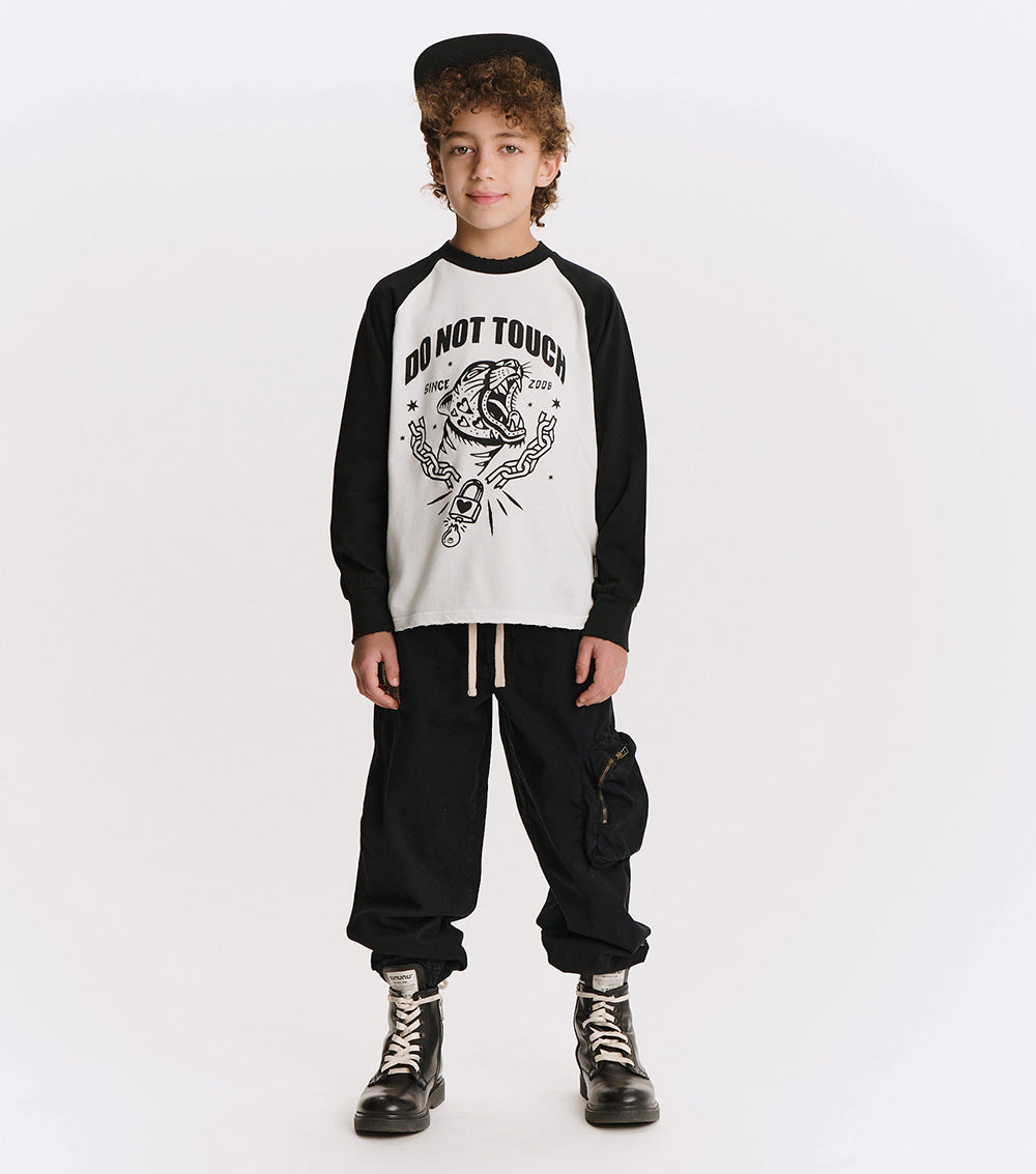 a laid back look, leveled up. these black drill pants bring that fave relaxed fit with a street style twist. the leg features a massive square side pocket with a zipper that wraps all the way around because your kid deserves pants that double as a backpack when they’re on the go. elastic waistband and cuffs keep them in place and two stealth side pockets make stashing extras easy. yup, every kid needs a pair.