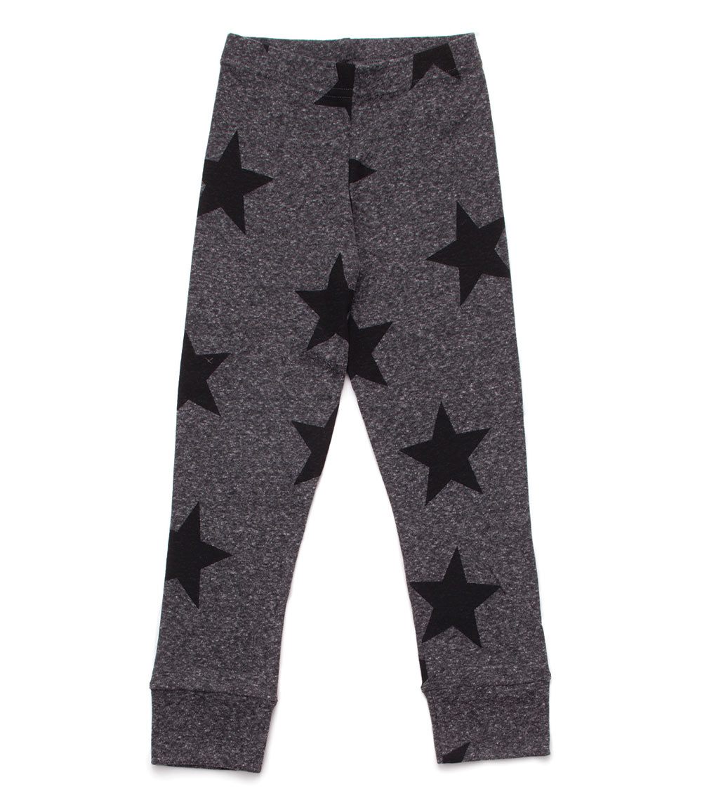 superstar attitude, relaxed state of mind. these super-soft charcoal grey leggings for boys & girls alike are a classic nununu piece, featuring our signature all-over star print. leggings are pants (when they look this good), after all.