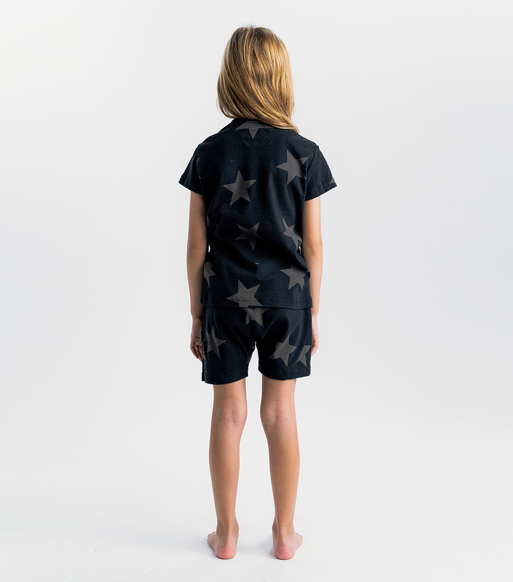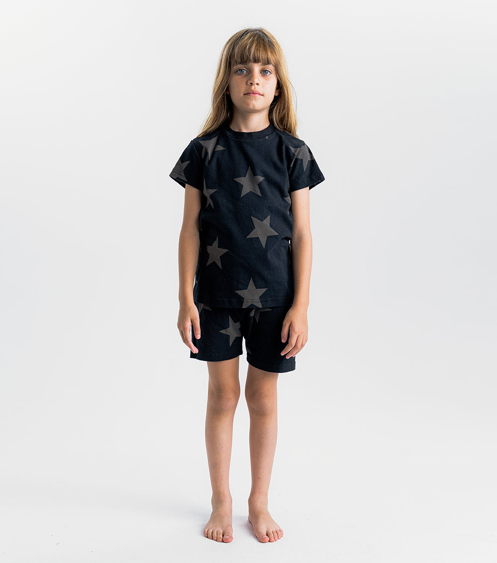 your fave nununu boy or girl will enjoy chilling out, going to sleepovers or just relaxing with the family in this unisex set. constructed of super comfy fine rib, the black t-shirt & shorts combo is ideal for the warm & breezy spring and summer months, spangled with our famous star print.