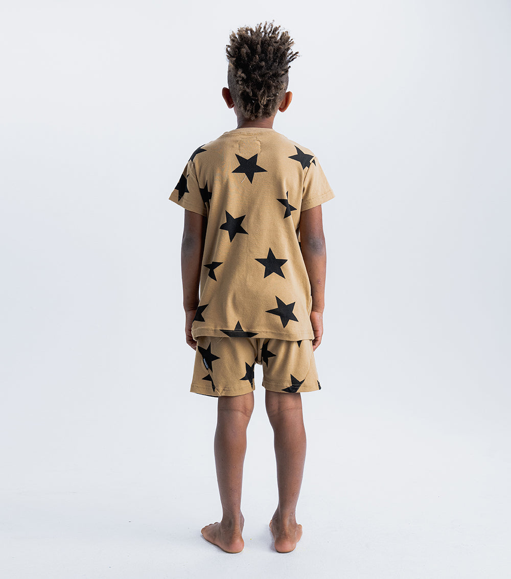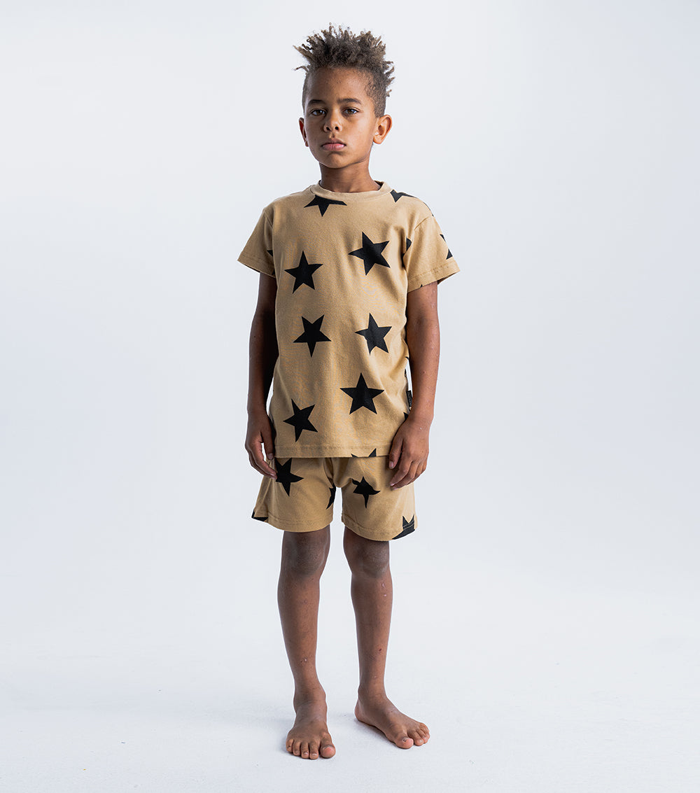 your fave nununu boy or girl will enjoy chilling out, going to sleepovers or just relaxing with the family in this unisex set. constructed of super comfy fine rib, the wood t-shirt & shorts combo is ideal for the warm & breezy spring and summer months, spangled with our famous star print.