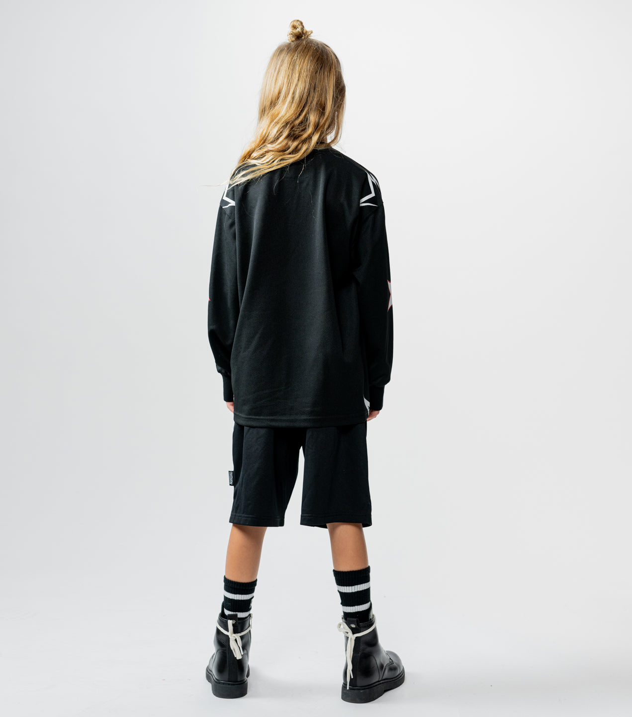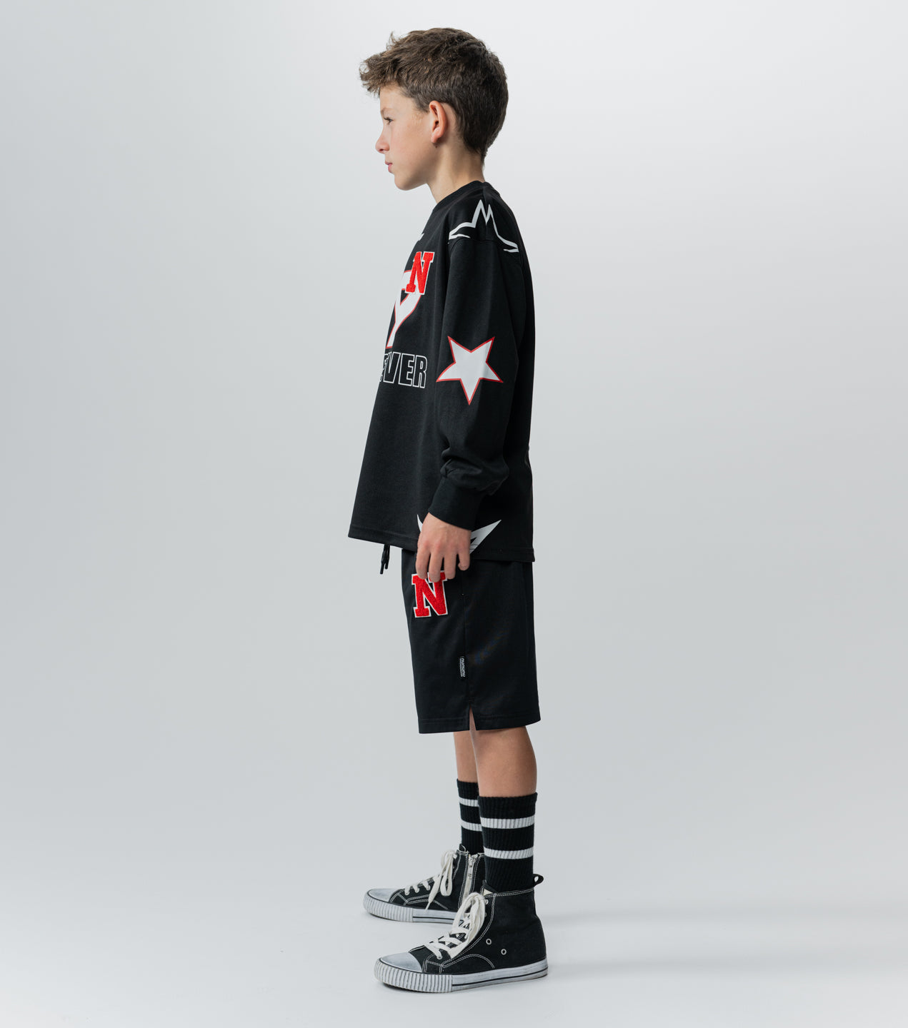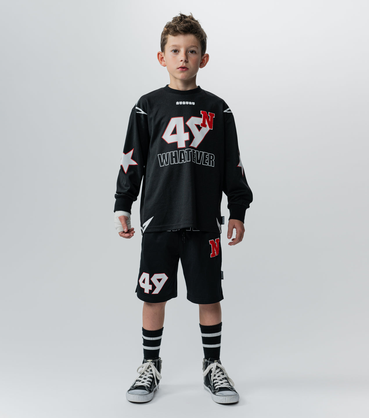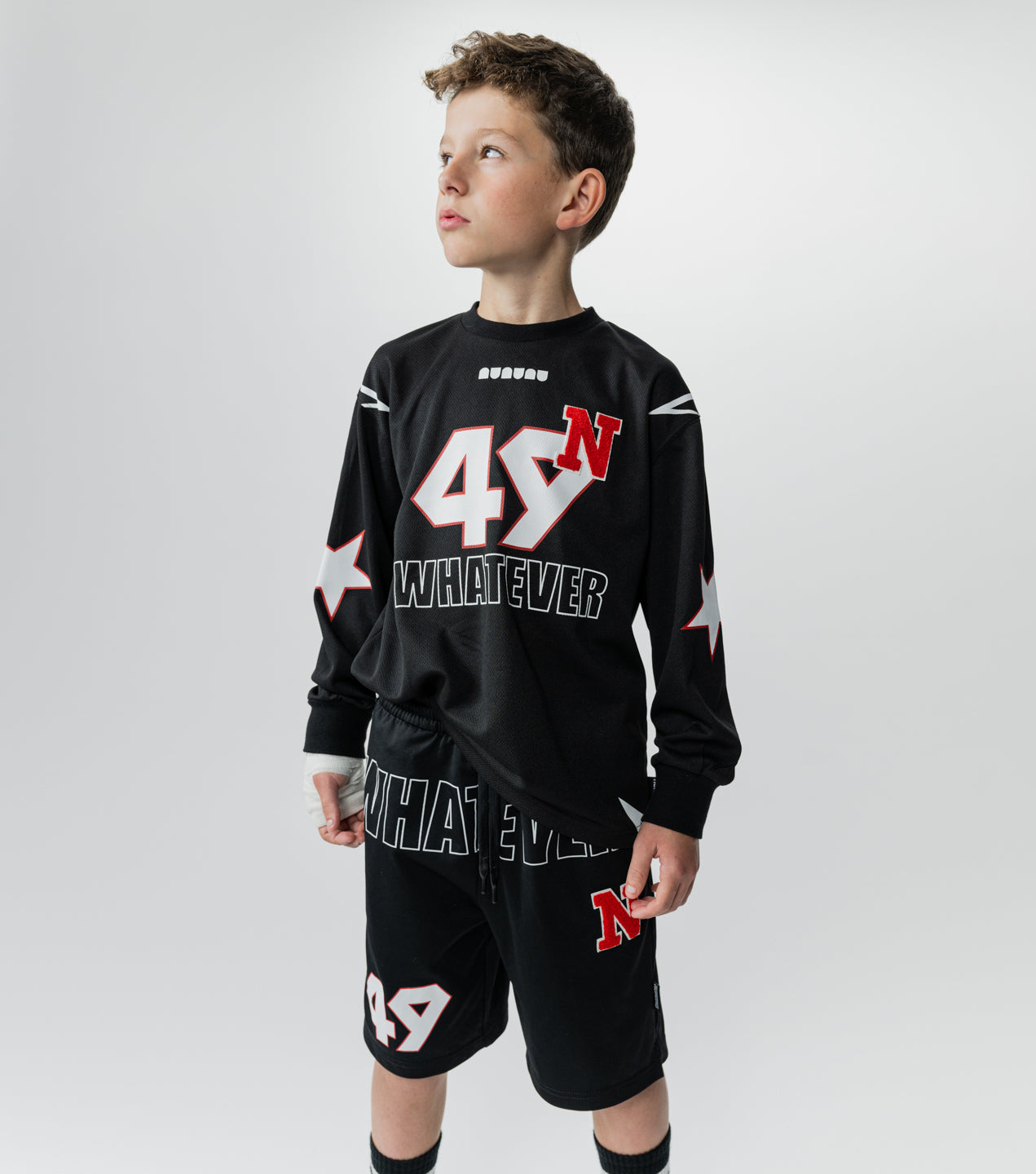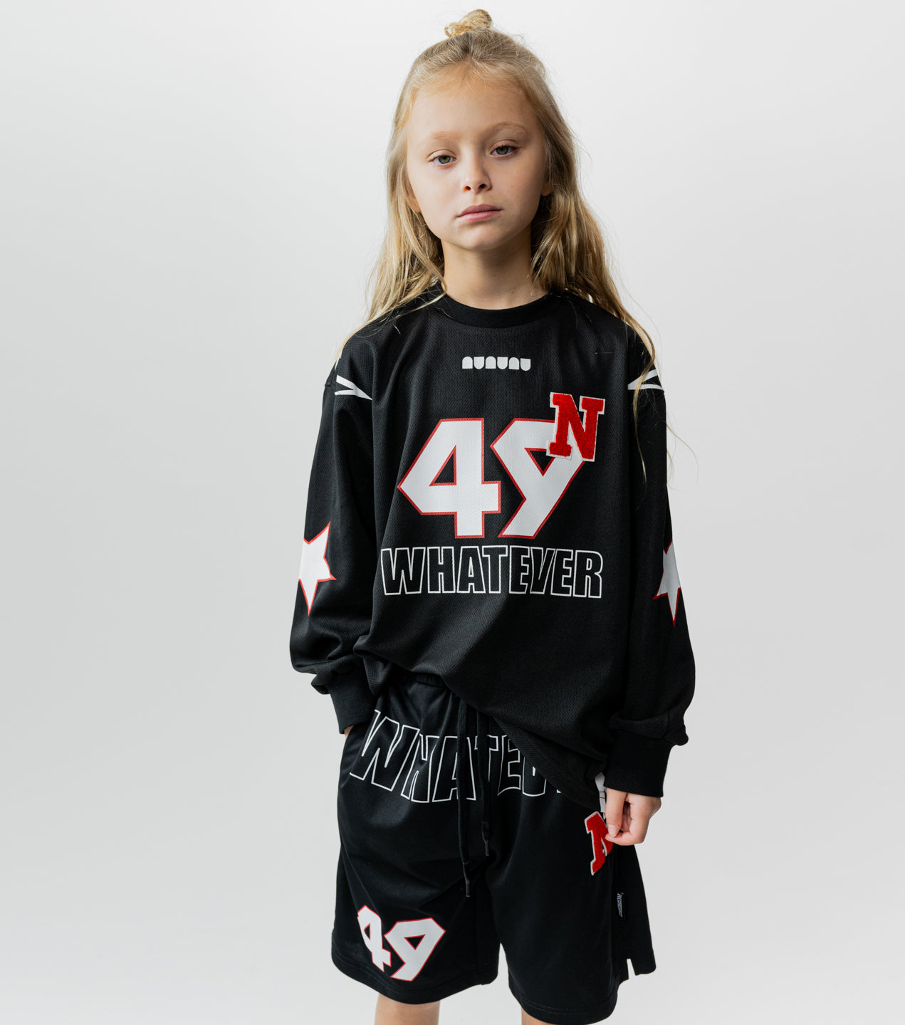 team nununu has assembled and they’re all wearing this totally fierce gender-neutral shirt. it’s made of a black matte light active poly with a nearly sheer quality so it’s super light & breathable. we’ve given it all the best elements just like you gave your kid. it’s got bold outlined stars on the shoulders & sleeves, plus our totally touchable n patch made of a towel-y material placed like an exponent over your kid’s new number 49. because you know they’re always bringing the power. oh, and our logo sits up front & center so they can rep their squad. of course, it says whatever in outlined block letters because the kid wearing this shirt plays by their own rules and always wins.