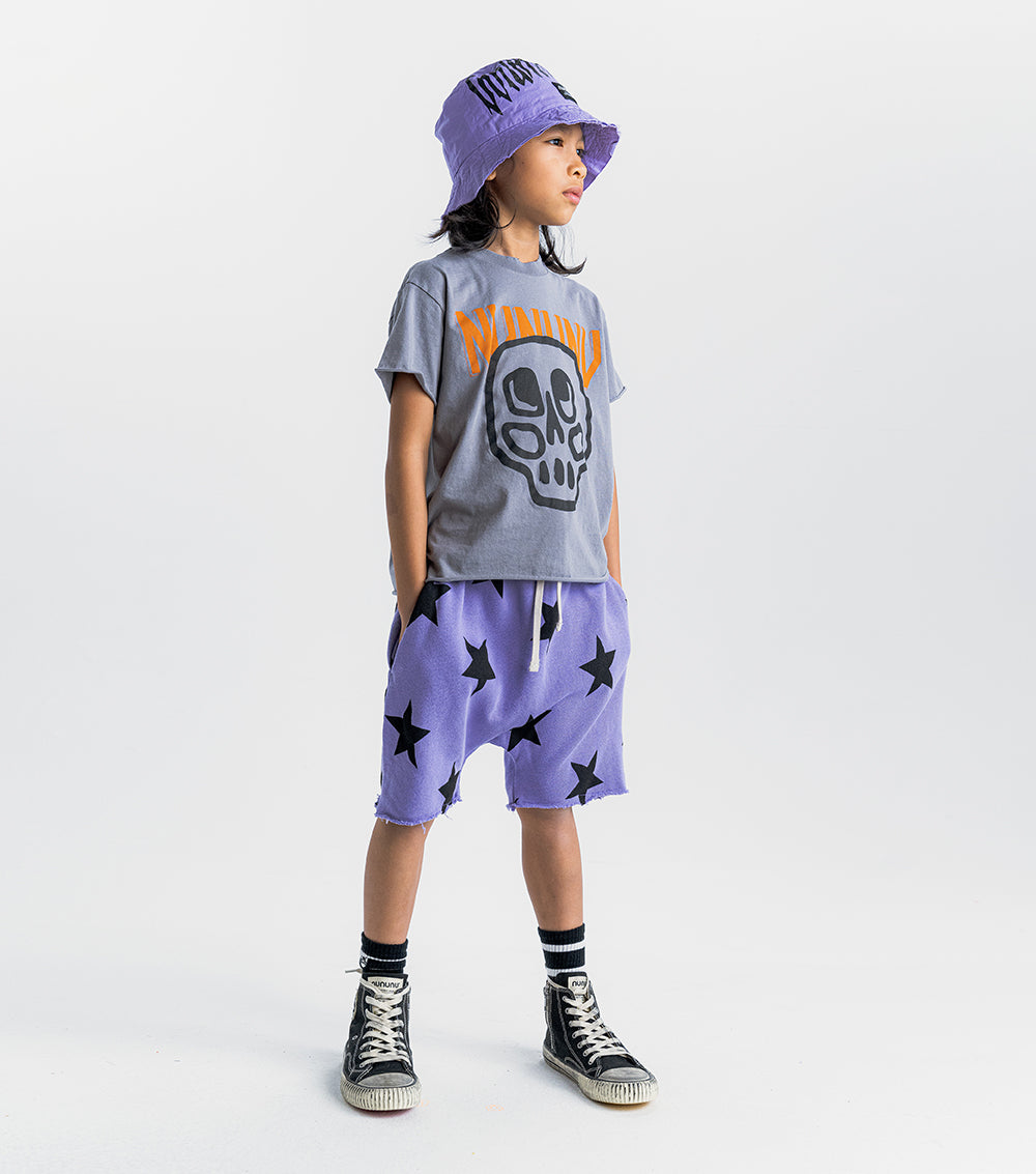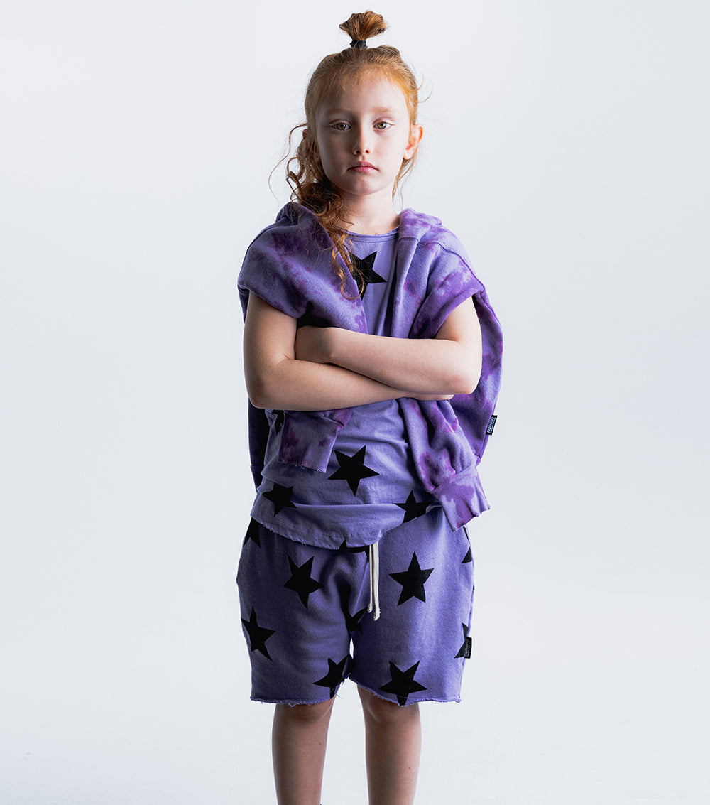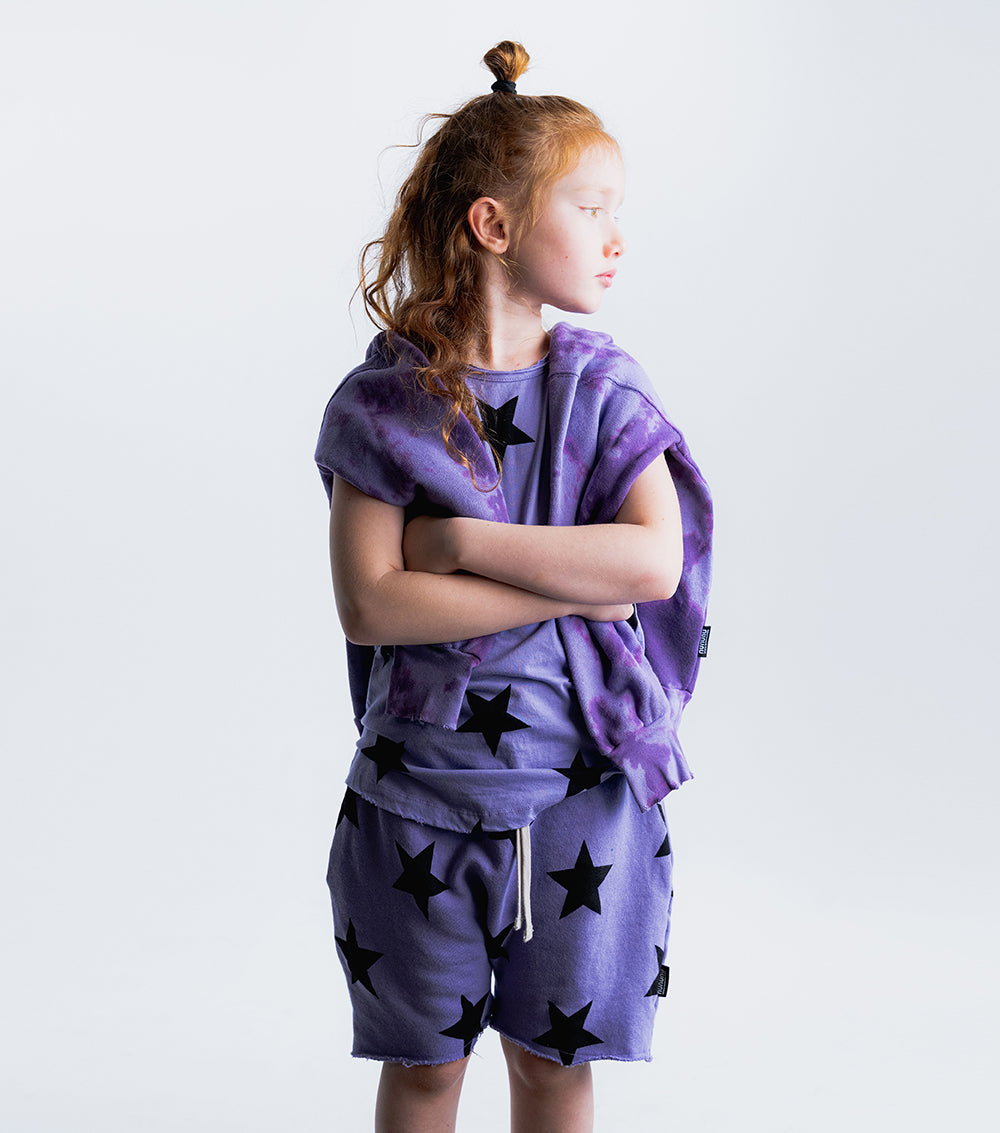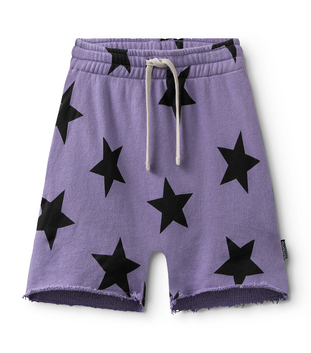 these mauve mist unisex sweat shorts have our signature star print all over. made of fine french terry, they have this cool, rounded shape that creates lots of freedom in the crotch area. for added grunge, the legs are cut off & left raw just above the knee. an elastic drawstring waist means you can easily throw ‘em on with swimsuits, tank tops, tees & anything else. plus, sleek slanted side pockets & a little back pocket are there for stashing sunglasses, headphones, or contraband lollipops while on the go.