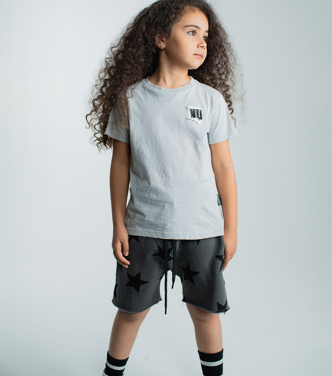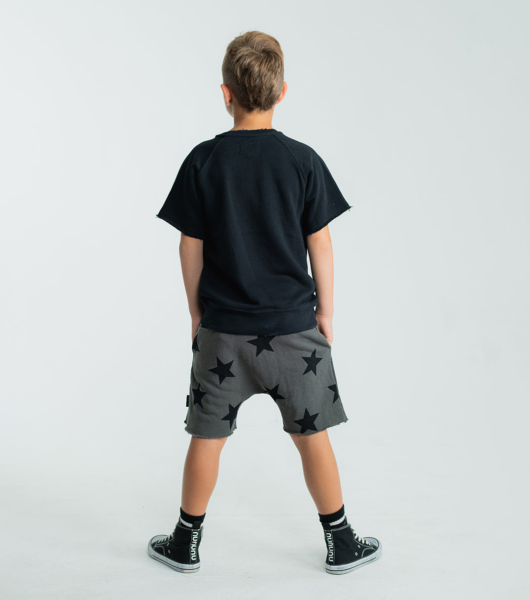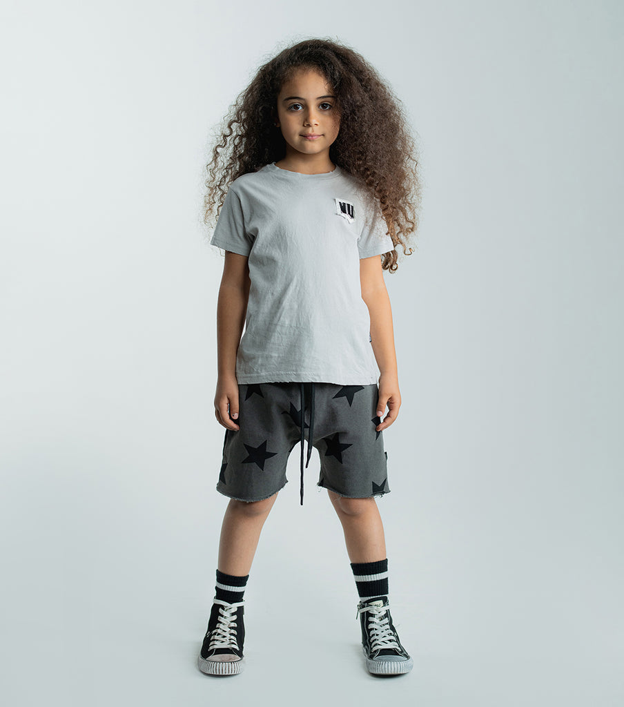 these dyed graphite grey unisex sweat shorts have our signature star print all over. made of fine french terry, they have this cool, rounded shape that creates lots of freedom in the crotch area. the legs are cut off & left raw just above the knee. an elastic drawstring waist means you can easily throw ‘em on with swimsuits, tank tops, tees & anything else.