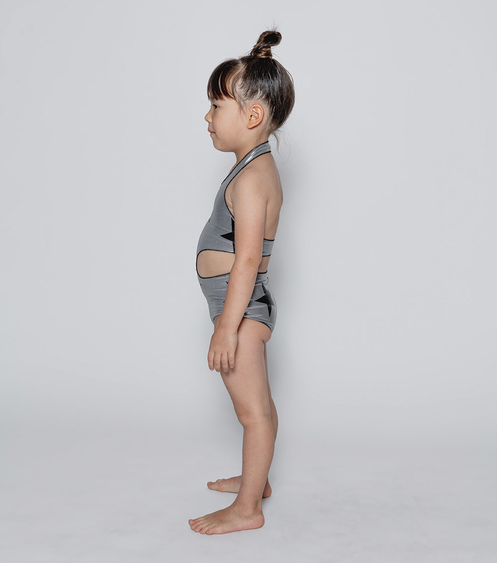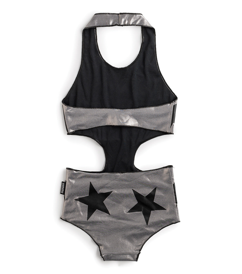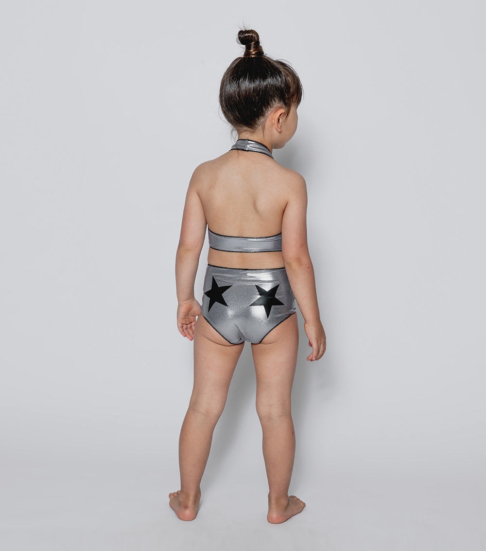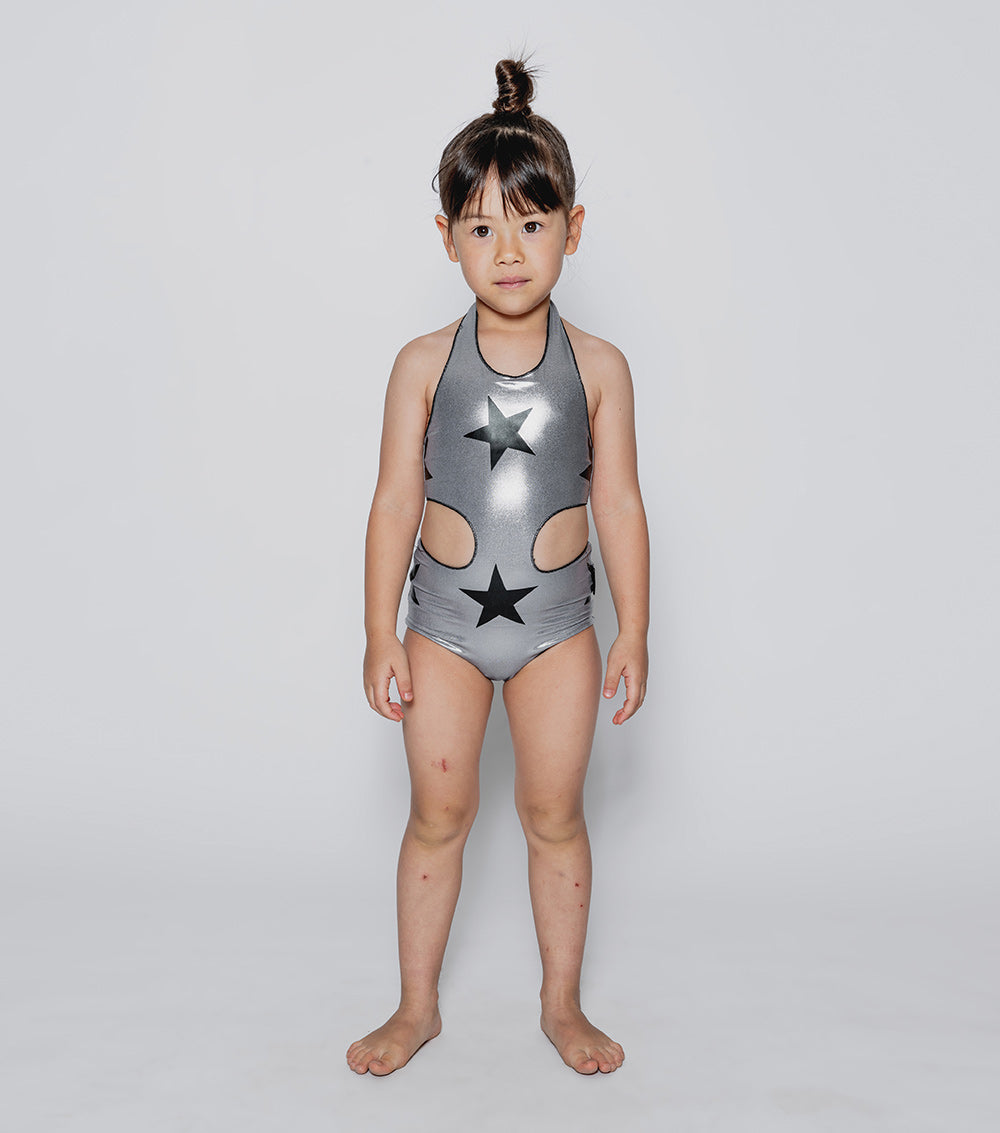 be a superstar in & out of the water. this silver swimsuit for girls has major hollywood vibes, with super shiny foil material & our beloved star print all over. a halter neck & side cutouts keep this baby right on trend. style her with pants or a skirt for an impromptu party appearance.