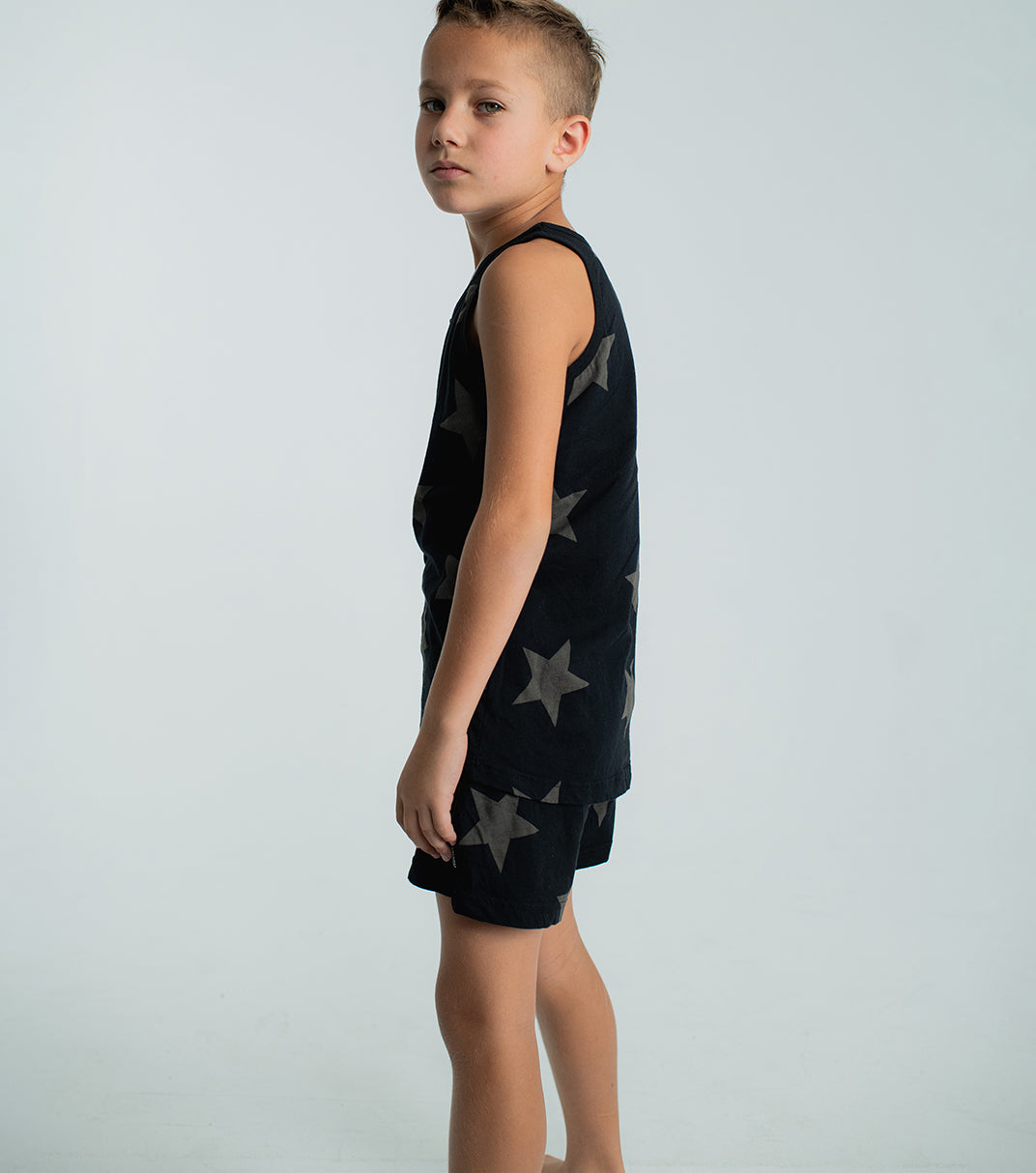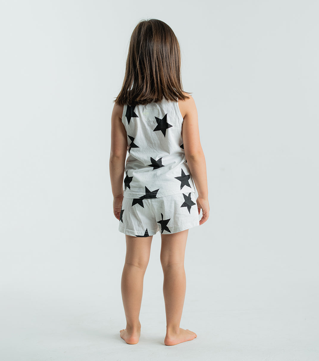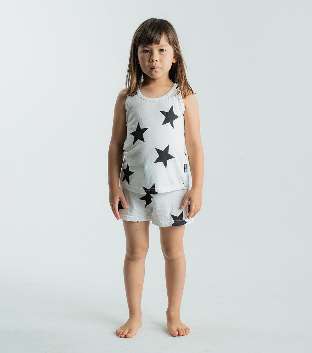 for sleeping, lounging or just hanging out, this super soft white cotton jersey tank lounge set is a great look for the homefront or to wear on long plane rides. a simple tank top coordinates with elastic-waist shorts for a complete look that deserves to be seen by the world especially with our signature star print splashed all over.