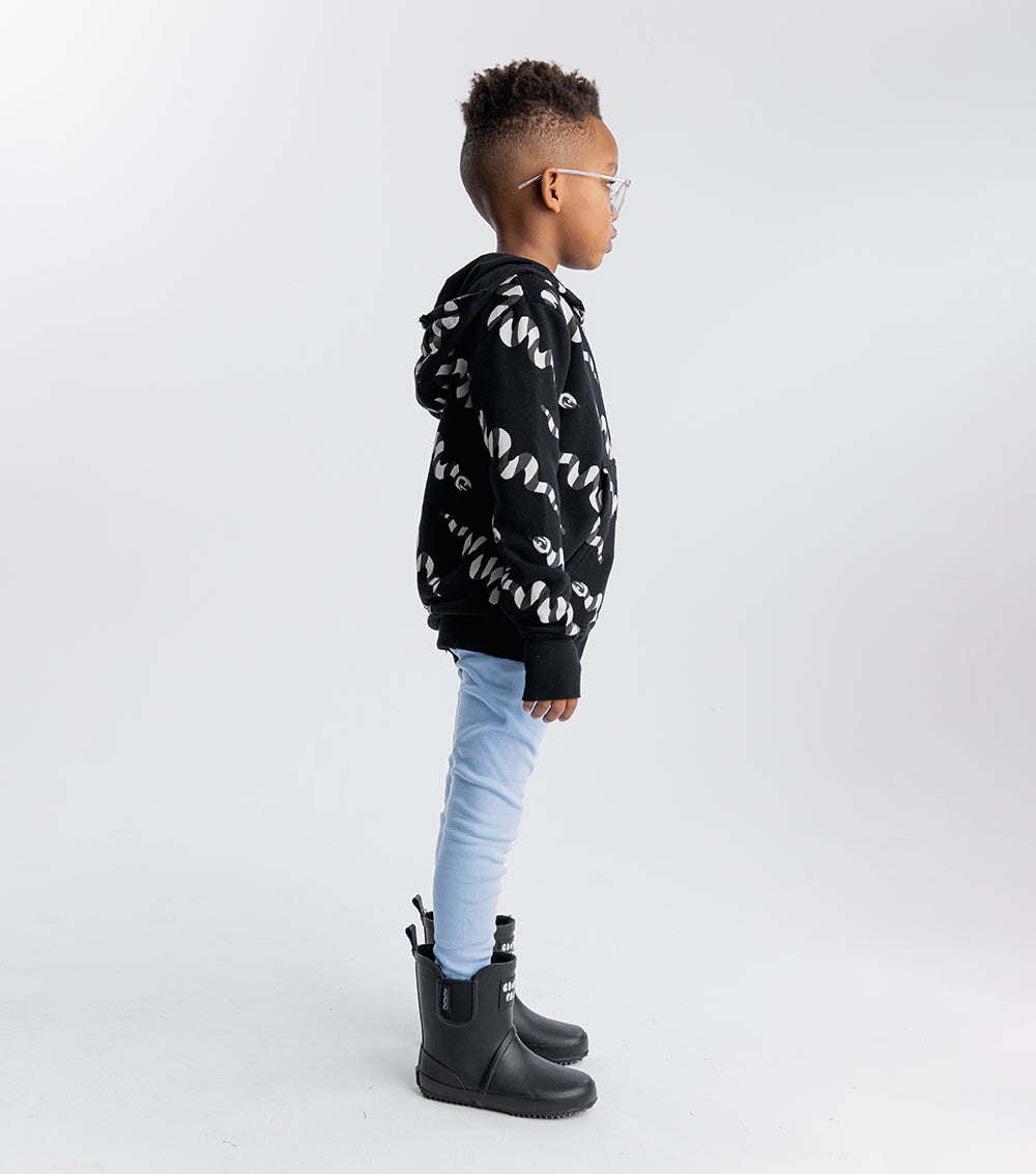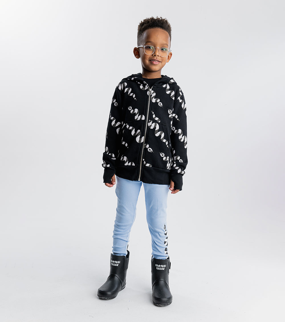 now don't get spooked, this stripey snake print doesn’t bite. to us, the symbol of the snake is all about rebirth & transformation. that’s why we’ve got this badass creature winding its way up the sick ribbed leg of these unisex foggy blue leggings, making its way up toward the super comfy branded elastic waistband. cuffs at the bottom are perfect to tuck in to some chunky black boots or roughed up sneaks. because a little scary is a lot cute