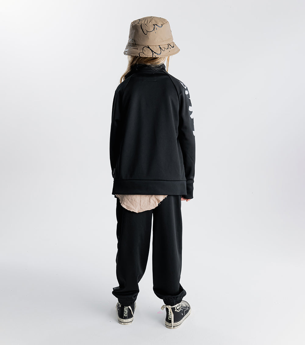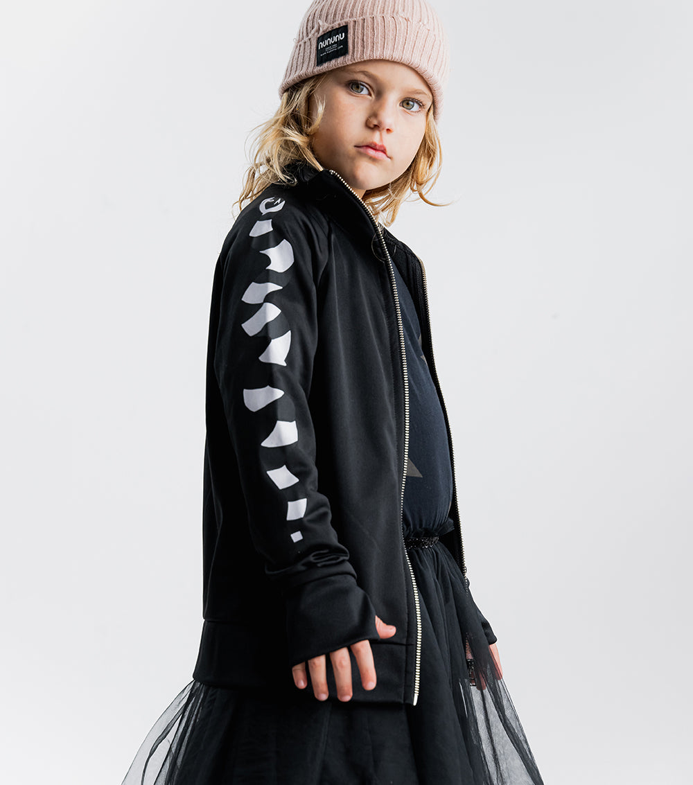 we’re reimagining the classic black track suit and giving it the freshest, sportiest upgrade ever. the cut is straight and to the point with a zipper that goes all the way up the slick collar. the inside has a super soft feel making it impossible to want to take off. with artist shay id alony’s dizzy skull embroidered patch, plus a vicious little viper up one sleeve, it is as gutsy as the boy or girl wearing it. but, don't worry, this beast won’t bite.