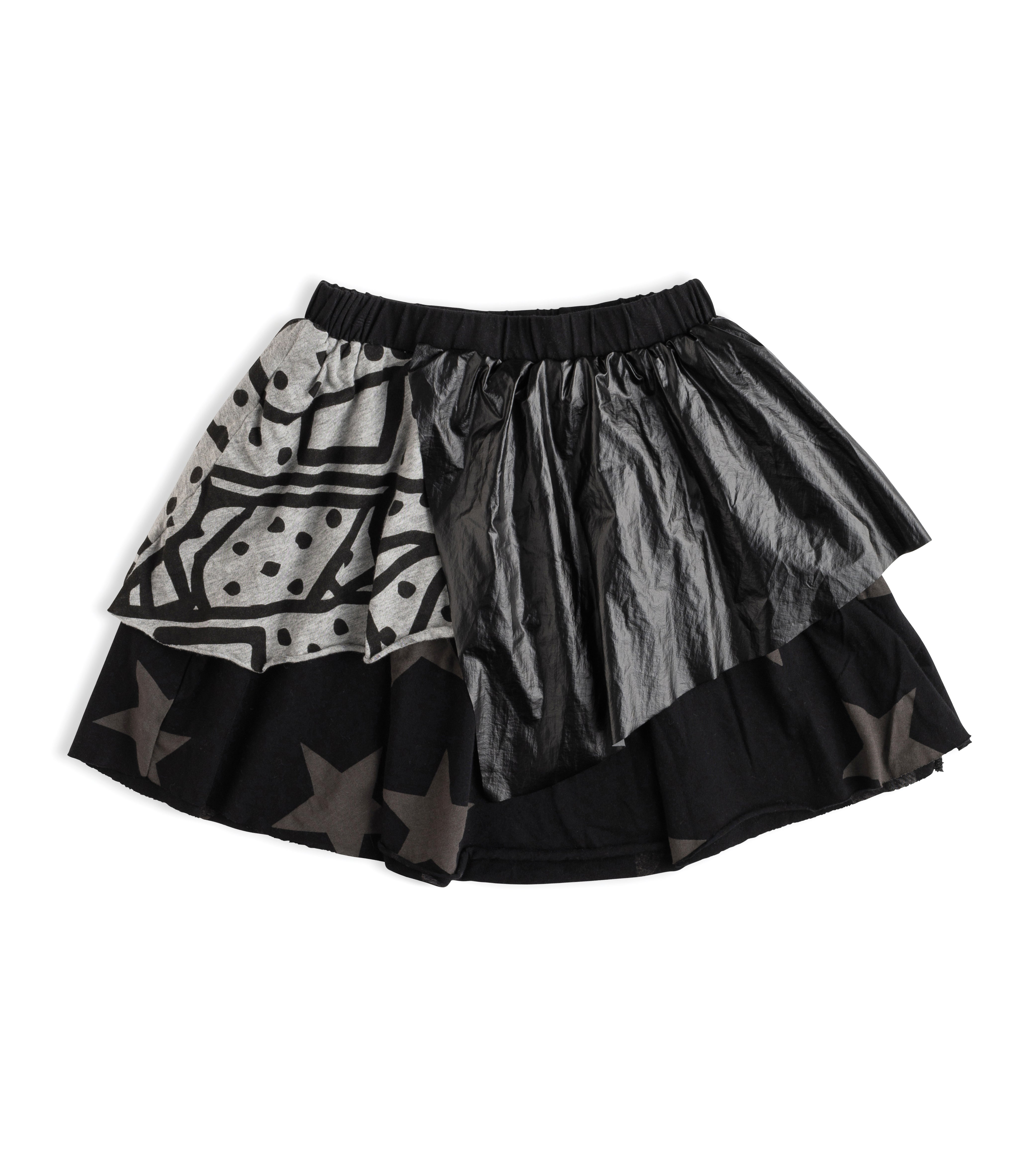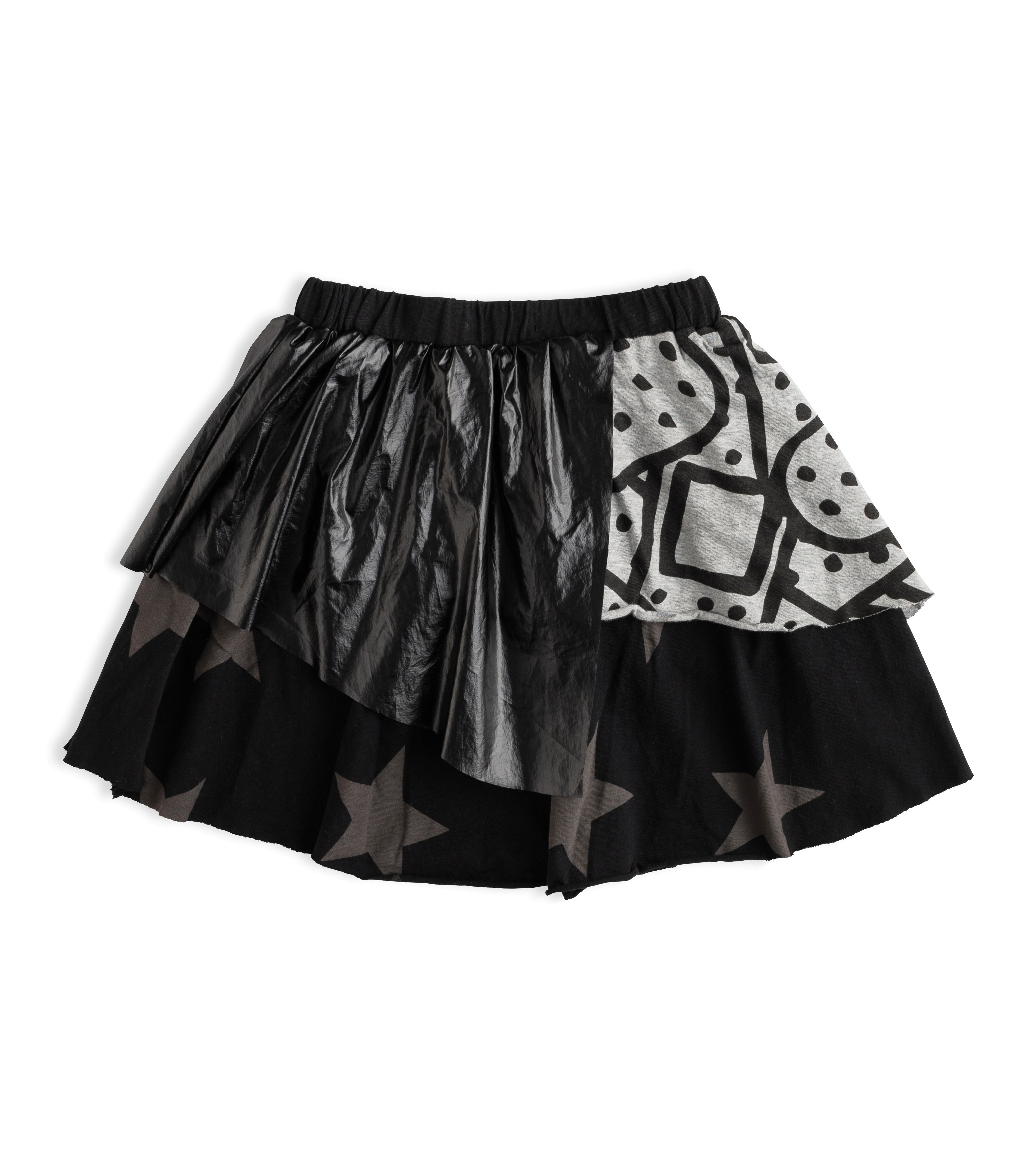 there’s a real ‘80s badass feel to this layered skirt with lots of elements & textures. black nylon & cotton jersey mix in an overlapping, asymmetrical fashion, with our beloved star print & bandaid print (by artist dede) mixed in. this bad girl pairs with swimsuits, tanks, tees, hoodies—you name it. throw on chucks to tone it down or wear sandals to class it up. add tights & a jacket for a whole new look in the fall.