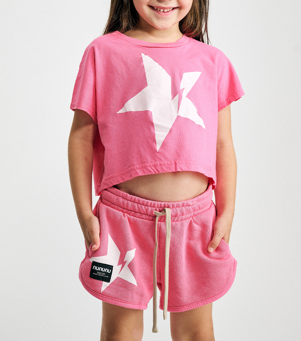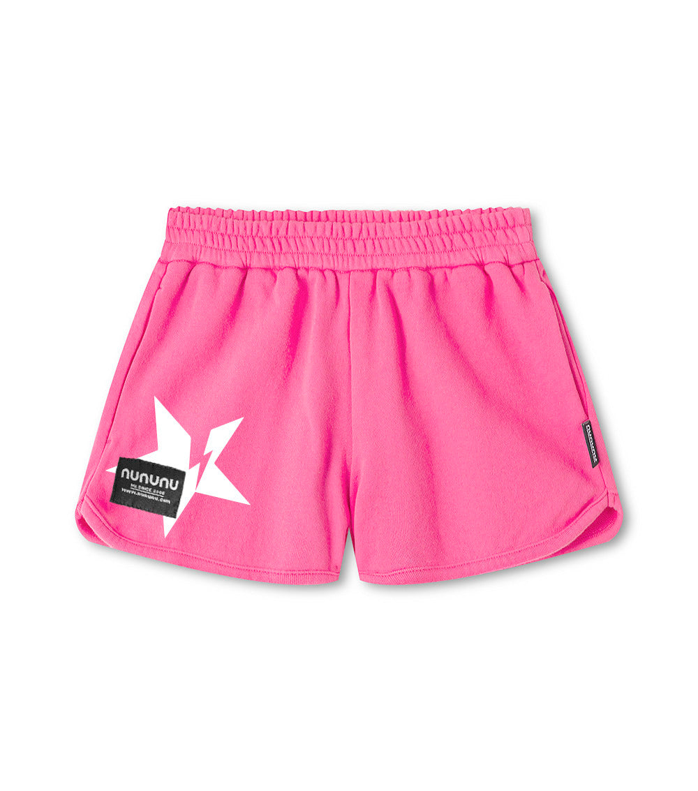 your gym class superstar finally found her perfect fit. these shorts. they’re made of hot pink french terry that's soft enough to actually get them up in time to be fashionably late for the morning school bell. the bottom hems have trim that’s a little rounded, coming up & overlapping a bit on the sides like classic retro gym shorts. of course, pockets are there for stashing notes passed in class and our splattered high voltage star is printed right across the front, so everyone knows who the real star is.