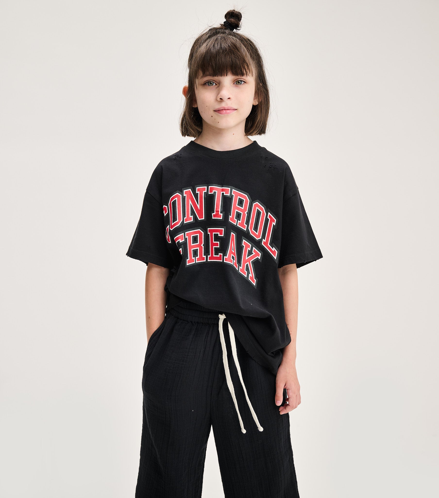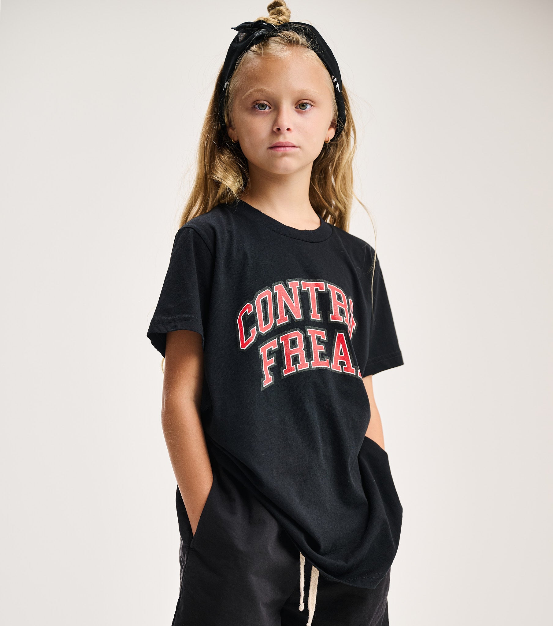 welcome to control freak university, your kid has just been accepted! of course, that's why we’ve got this bold t-shirt welcoming them to the club. it's a gender neutral cut made of black single cotton with custom deconstruction for that lived-in look. it says control freak in our collegiate style font with big, bold red lettering outlined in black & white to make sure anyone passing by gets the message loud & clear. the kid wearing this shirt rules the school.