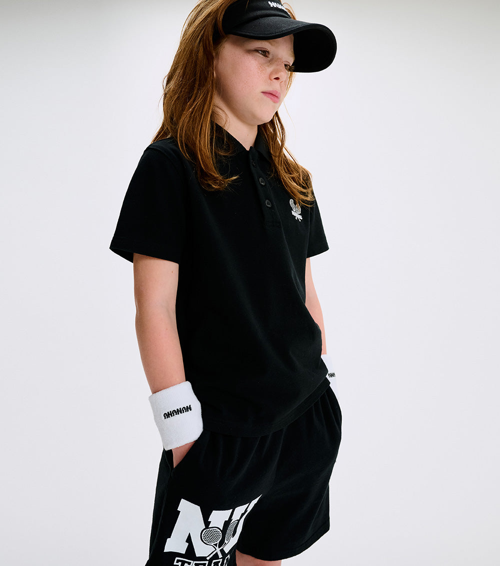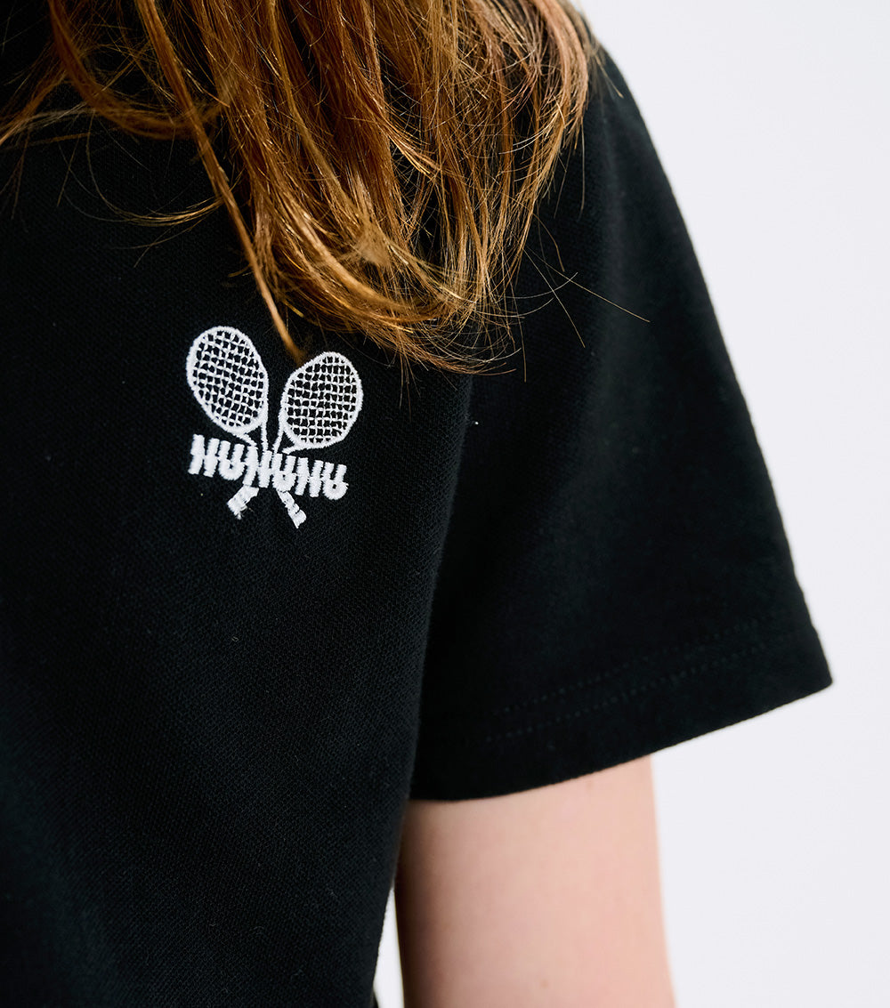 need a look that screams country club connoisseur? this is it. it’s a polo shirt made of black cotton pique so it’s extremely soft, flexible & cozy for all day play. even better, we've ditched the usual polo cut in favor of a t-shirt kind of vibe on the inner body but kept it classic with a soft rib collar, three tone-to-tone buttons, and clean edges. to top off this epic fit, our nununu dueling tennis rackets logo is embroidered in white on the chest, hinting at an impending challenge.