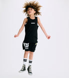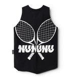 when the sun & the serves are both coming in hot, you’ll be glad you’ve got this breezy black tennis tank. it's an athletic cut made out of soft heavy single cotton that moves & breathes with you. we kept it business in the front with the sliced nununu logo & a clean collar but in the back it's a total party. the sleeves are cut wide & round almost like a racerback, taking a chunk out of our super cool dueling tennis racket print on the back, split by a center seam. hemlines on the bottom & sleeves are raw & rolling kind of like the ball away from your opponents after every ace.