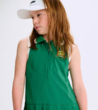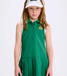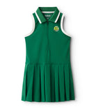serve looks & aces in this court-inspired fit. it’s a collared tank dress with a wide pleated skirt that’s giving country club vibes but with an edgy flair. it’s made of an active material with a crepe feel and features a hidden half zip. the collar & the edges of each sleeve are outlined in thick white for sporty contrast and the front has our smirking tennis ball mascot in a smooth sticker print ready to cheer you on at every point.