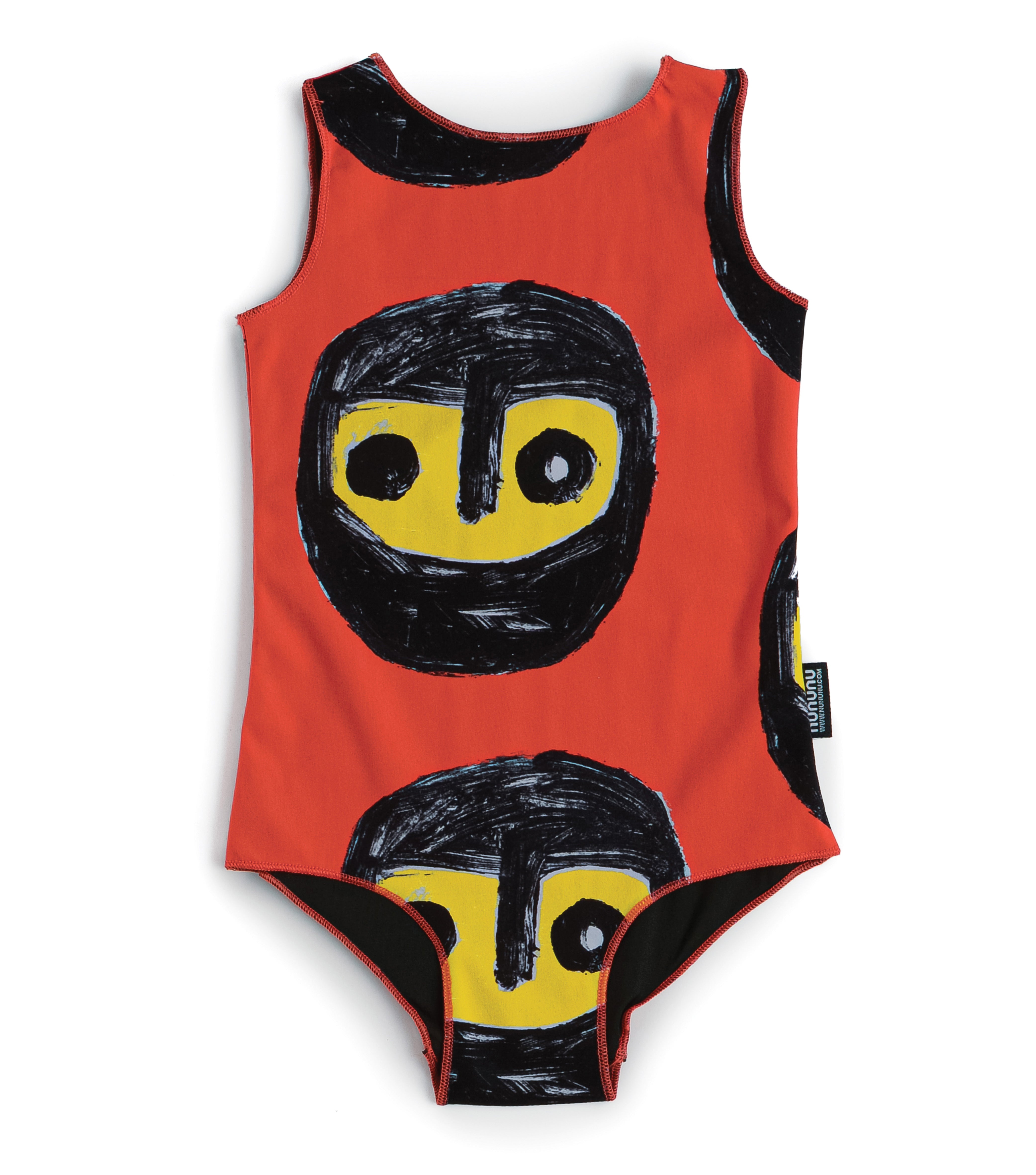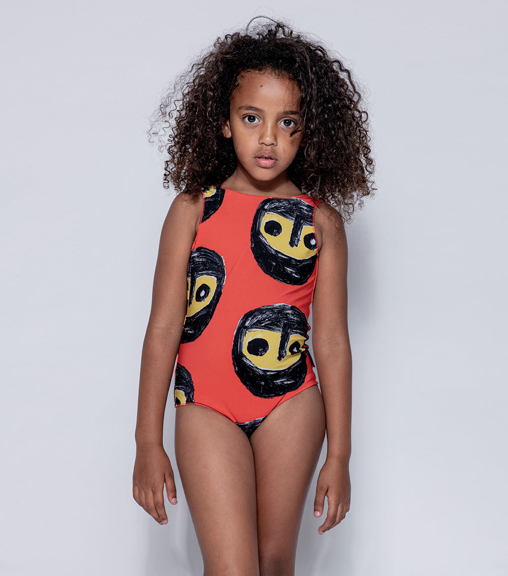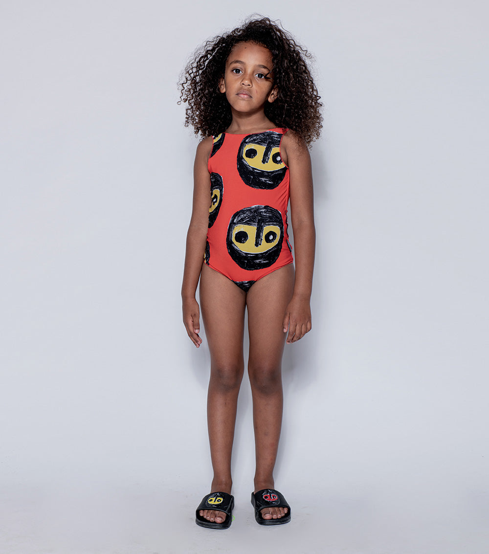 enter: the warrior. this very nununu design is a fun take on the global culture of face-covering that defines our times. he comes scribbled all over this statement-making red one-piece swimsuit for girls. high cut at the neck, it’s a classic tank suit that brings summer 2021 the energy we need.