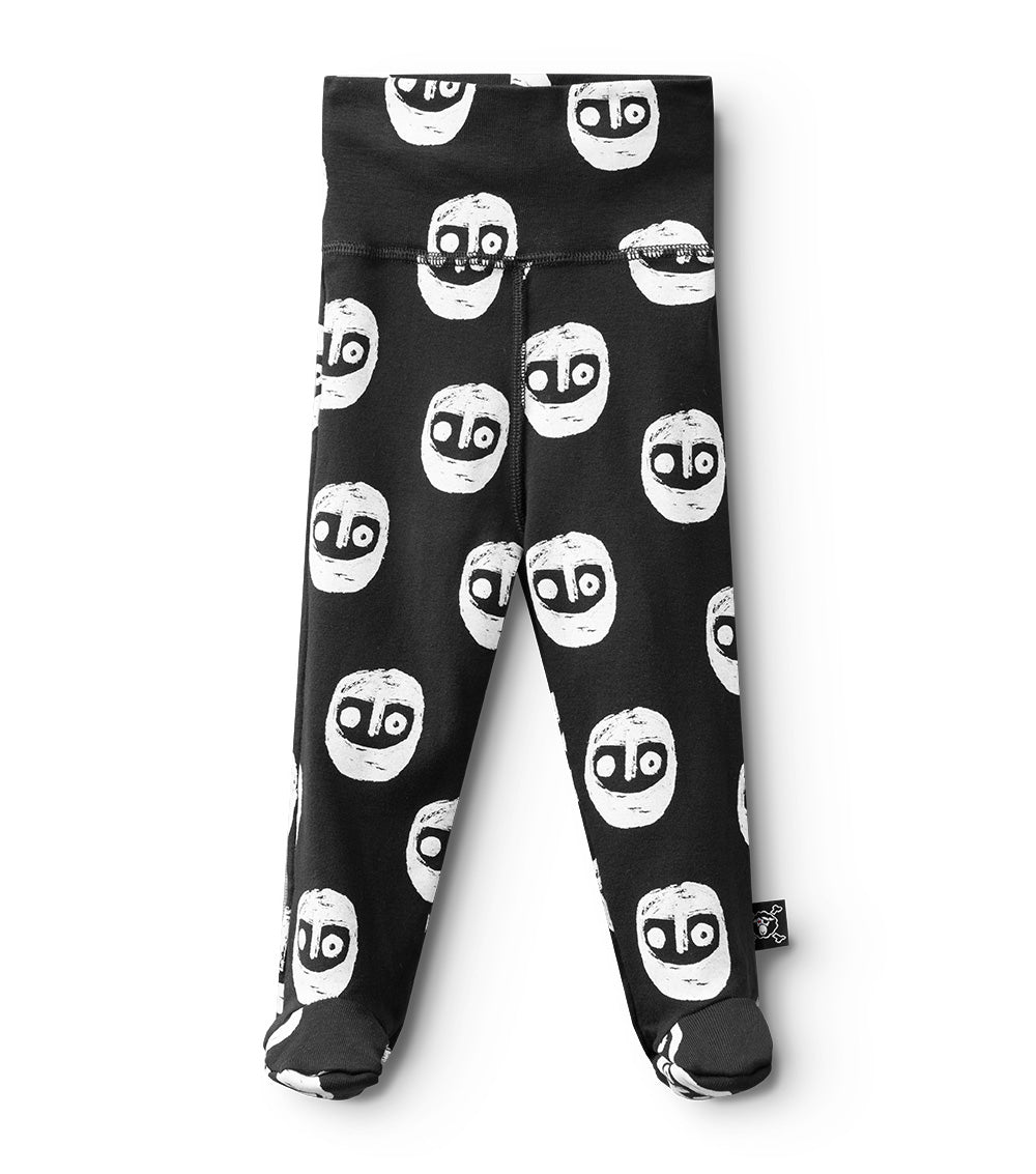 today’s babies are eventually going to hear lots of stories about the crazy times in which they arrived. our warrior design, -a collaboration with artist shay id alony- is a symbol of the current global culture of face-covering, comes printed all over these awesome black footed leggings. they’re super comfy & highwaisted, so you can fold down the top or keep it up for more snugness. style ‘em with a onesie or nununu sweatshirt for extra swag. they don’t require shoes, so that’s one less thing.