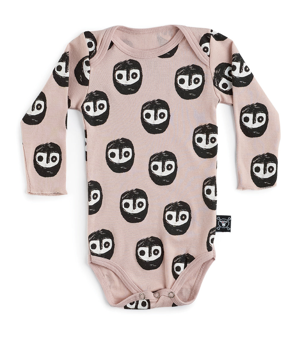 today’s babies are eventually going to hear lots of stories about the crazy times in which they arrived. our warrior design, -a collaboration with artist shay id alony- is a symbol of the current global culture of face-covering, comes printed all over this awesome powder pink long sleeve baby onesie. it’s a classic shape that goes on with zero friction. snaps at the crotch make diaper changes a no-fuss situation, and shoulder flaps let you pull it down from the top—whatever’s easiest in the moment.