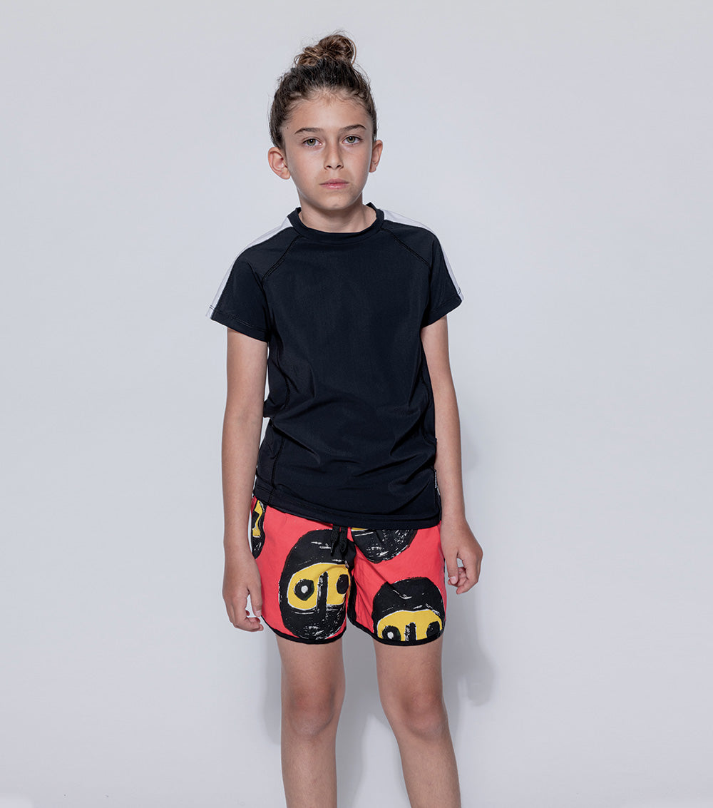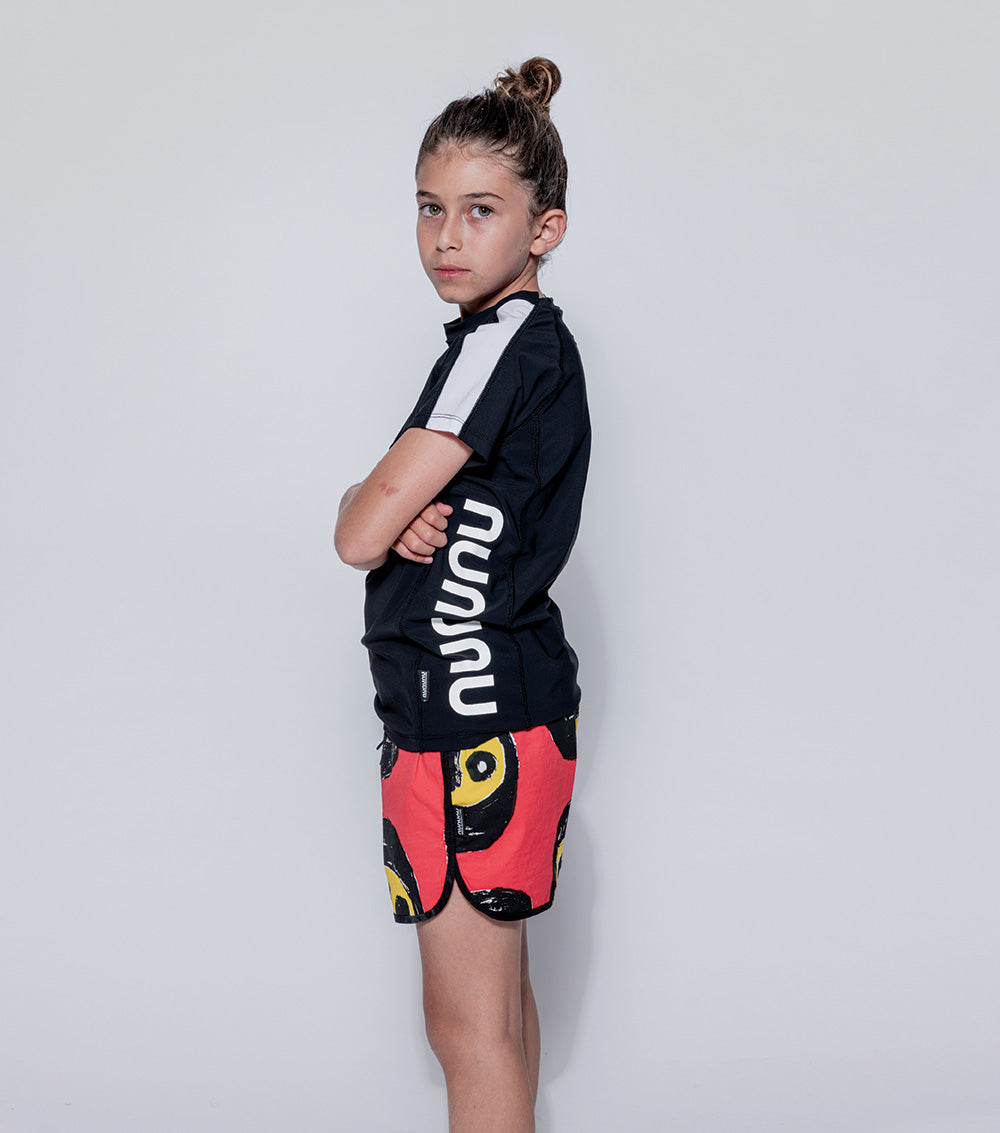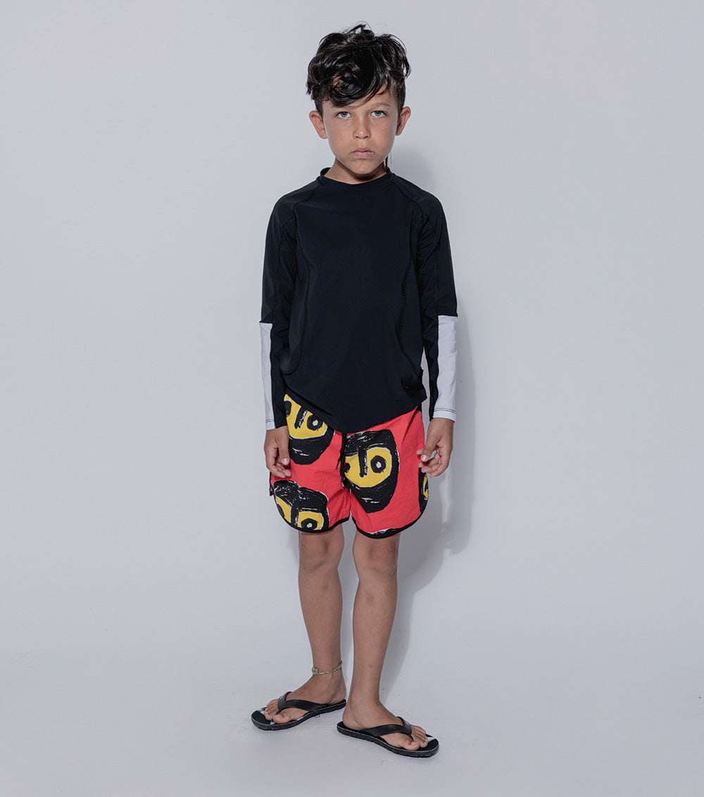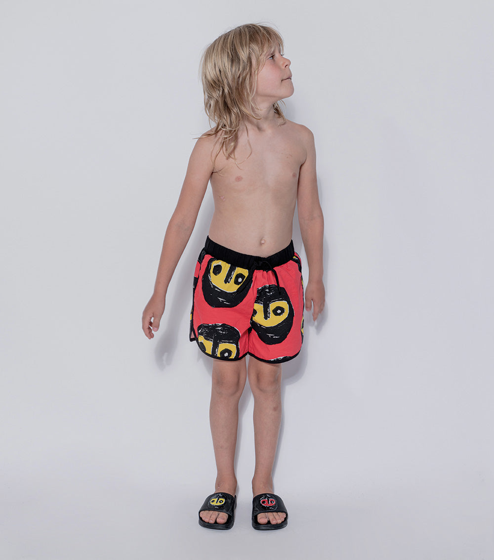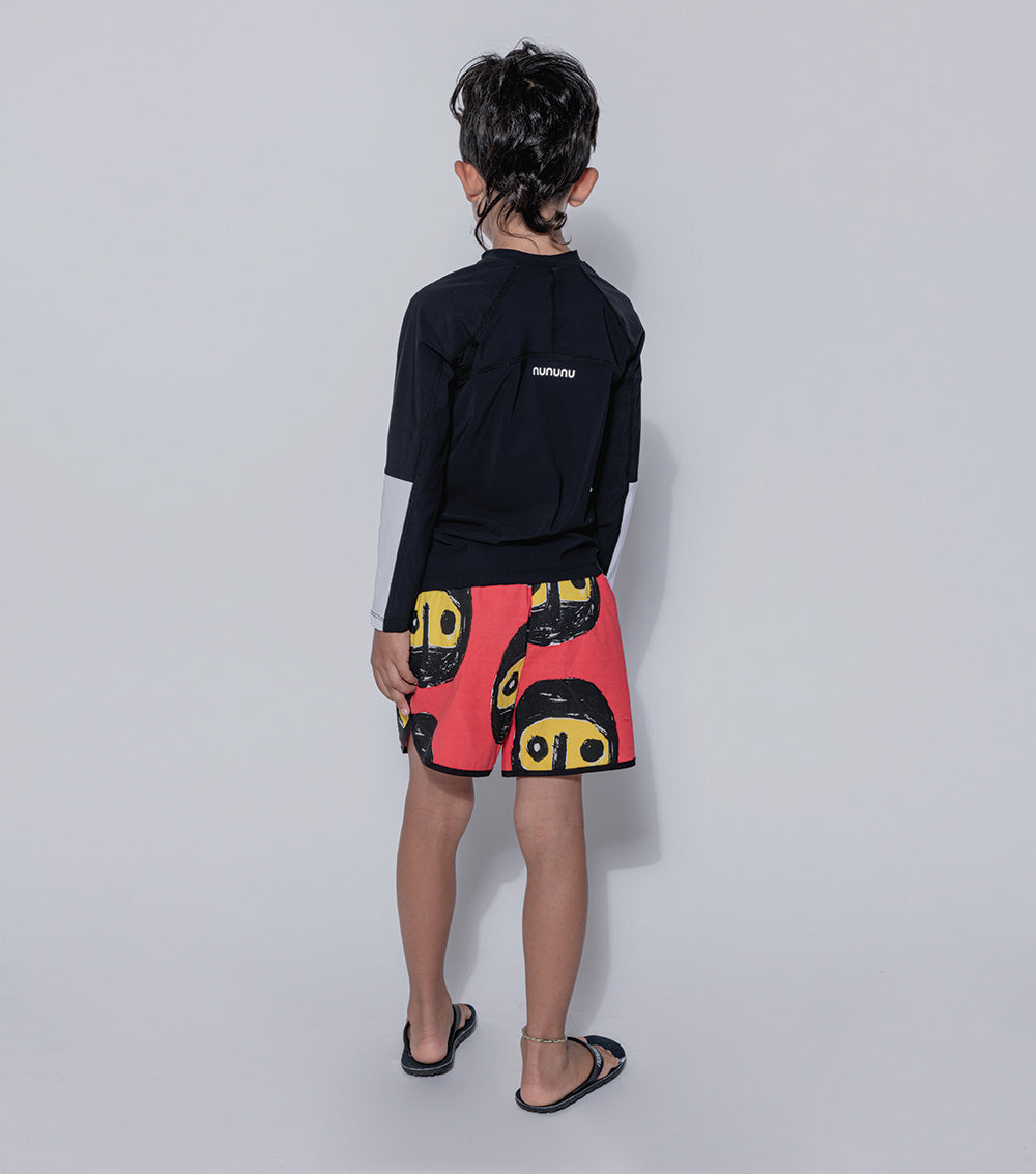 enter: the warrior. this very nununu design is a fun take on the global culture of face-covering that defines our times. he comes scribbled all over this red swimsuit for boys & girls. a bit trimmer than classic boardshorts, these guys have more of a gym short cut, with rounded, piped edges. elastic drawstring waist helps avoid de-pantsing when a big wave hits.
