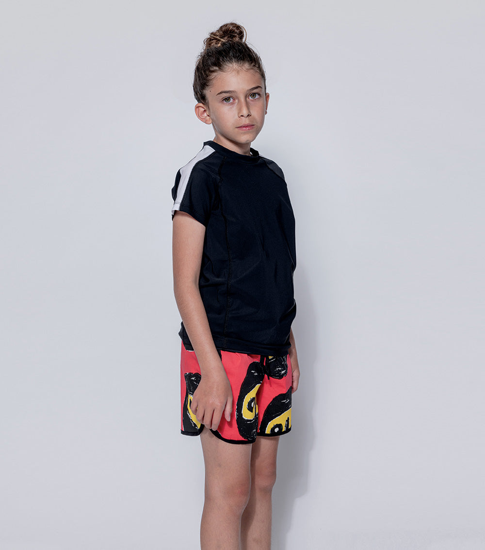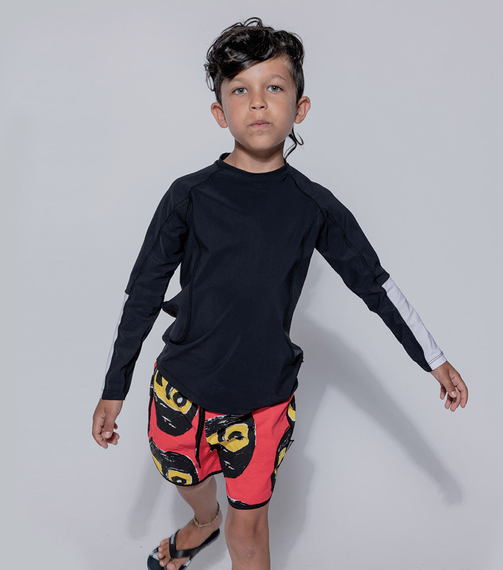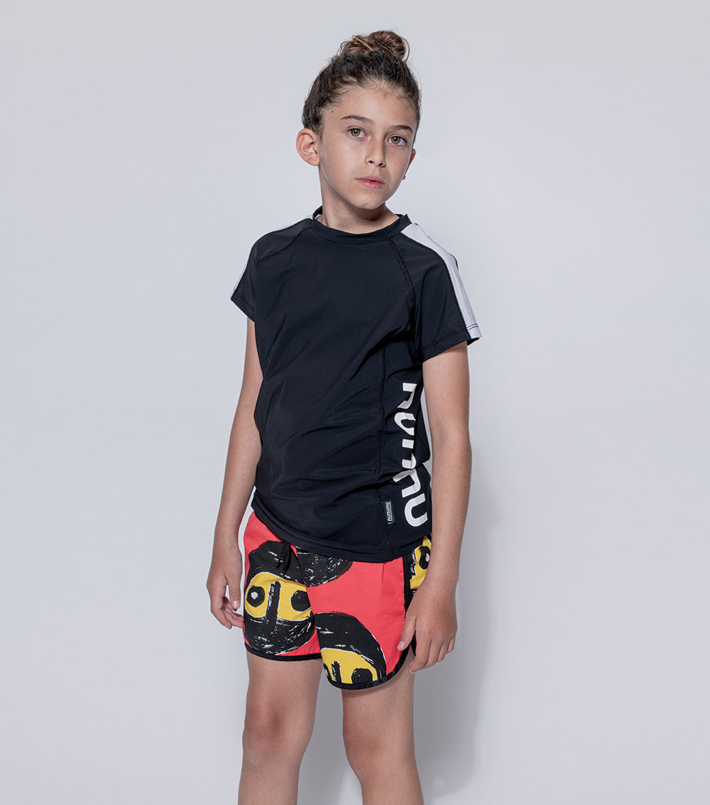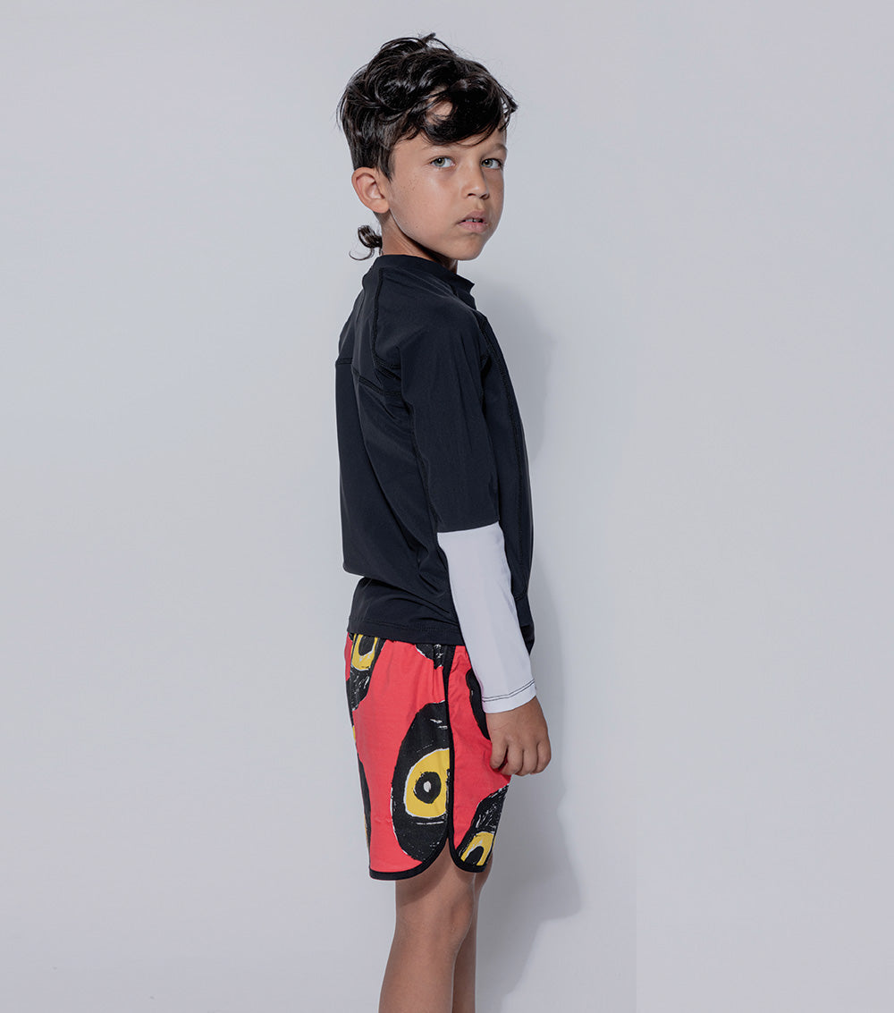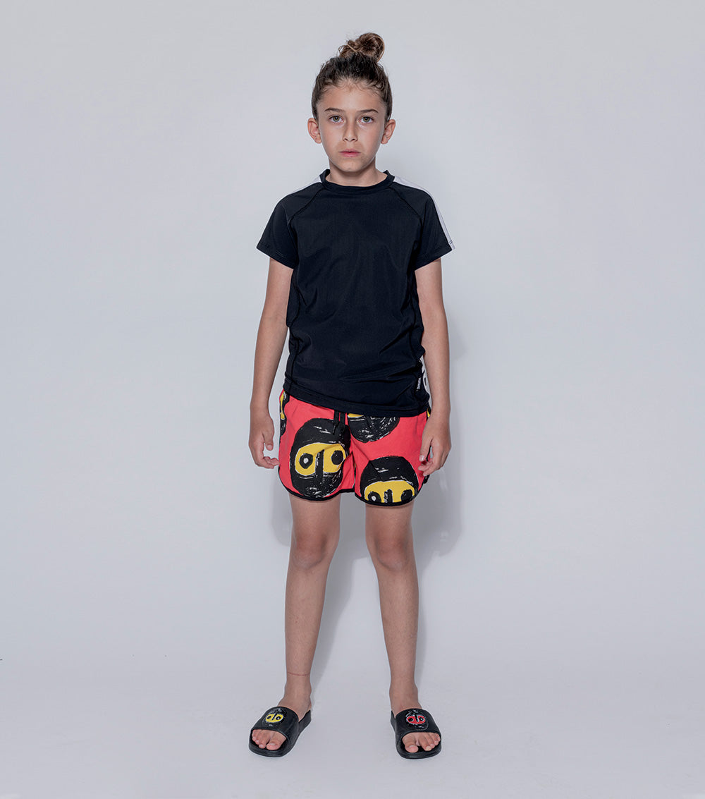enter: the warrior. this very nununu design is a fun take on the global culture of face-covering that defines our times. he comes scribbled all over this red swimsuit for boys & girls. a bit trimmer than classic boardshorts, these guys have more of a gym short cut, with rounded, piped edges. elastic drawstring waist helps avoid de-pantsing when a big wave hits.