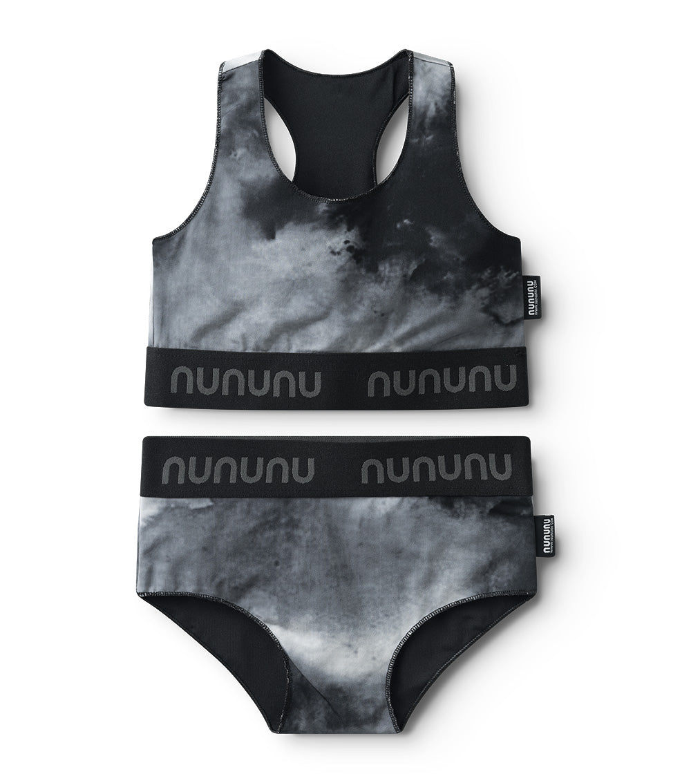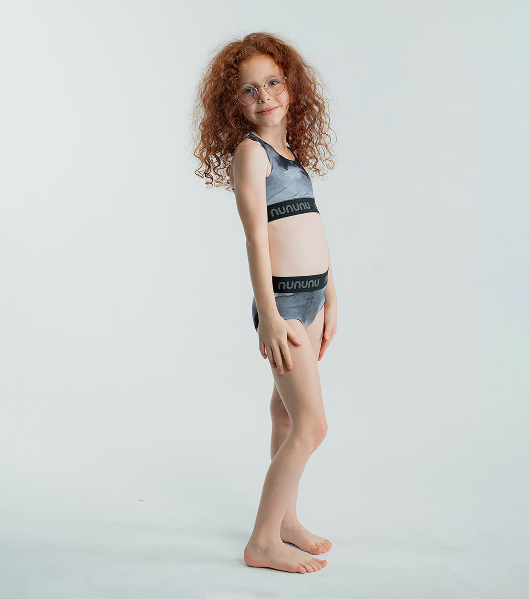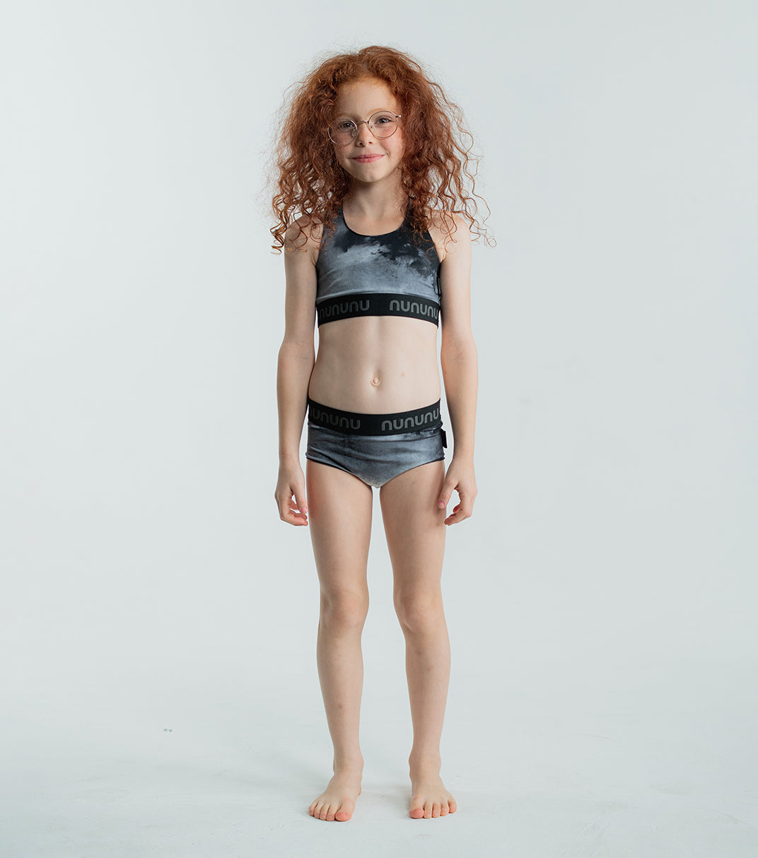 tie dye is still all the rage, and this two-piece girls’ swimsuit does it right. a swirl of black, white & gray mixes together in an allover print. a cool, high-neck top has a half-tank shape, with bottoms in that boyshort cut we love so much. both pieces are finished with our elastic logo band for a sporty vibe.