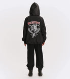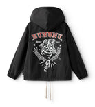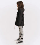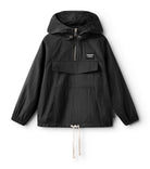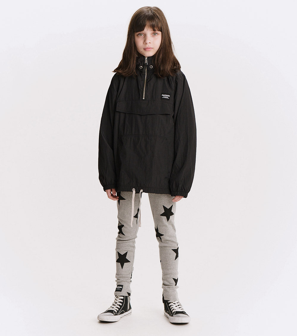 the kid who wears this fierce jacket definitely can't be tamed. it’s a black anorak made with nylon to give it that slick, breathable feel, made for movement. a big front flap pocket is actually fake, but we have you covered with huge side pockets! the drawstring hem lets you go puffy or straight depending on the mood. of course, it’s also got a ¼ zip up top, an easy hood, and comfy elastic cuffs. but it’s the back that really roars. our bold & beautiful print features a fearless kitty breaking out of captivity with nothing but love & determination. nununu arches across the top in red & white collegiate print along with since 2008, because just like this tiger, we’ve been breaking the mold for awhile now.