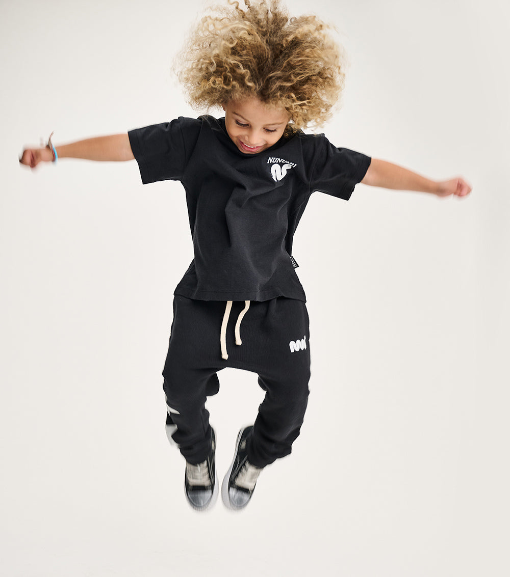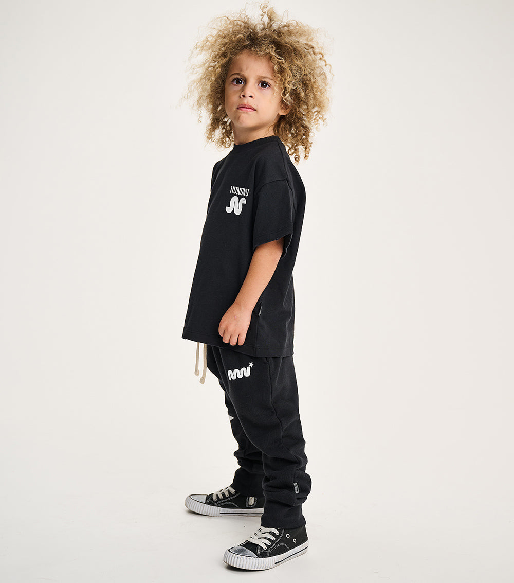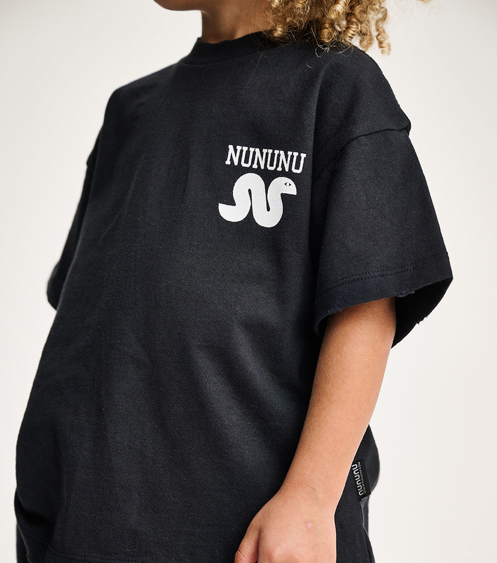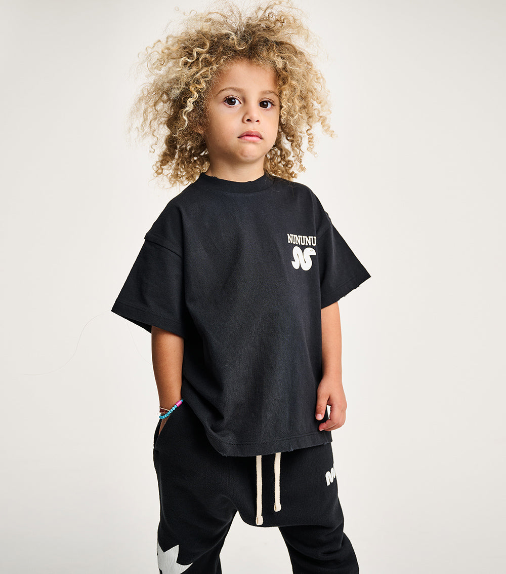 wanna keep it chill but with a twist? because nothing says it like a perfect black gender-neutral t, a needed basic in all kids closet. it’s made from heavy single cotton with a basic cut to keep the fit loose & look on top of things plus has custom deconstruction all around for that much needed grunge. to add a little magic, we added a small lucky snake print that feels textured and adds a wink.