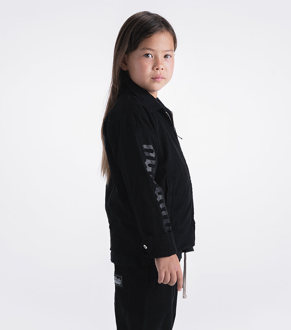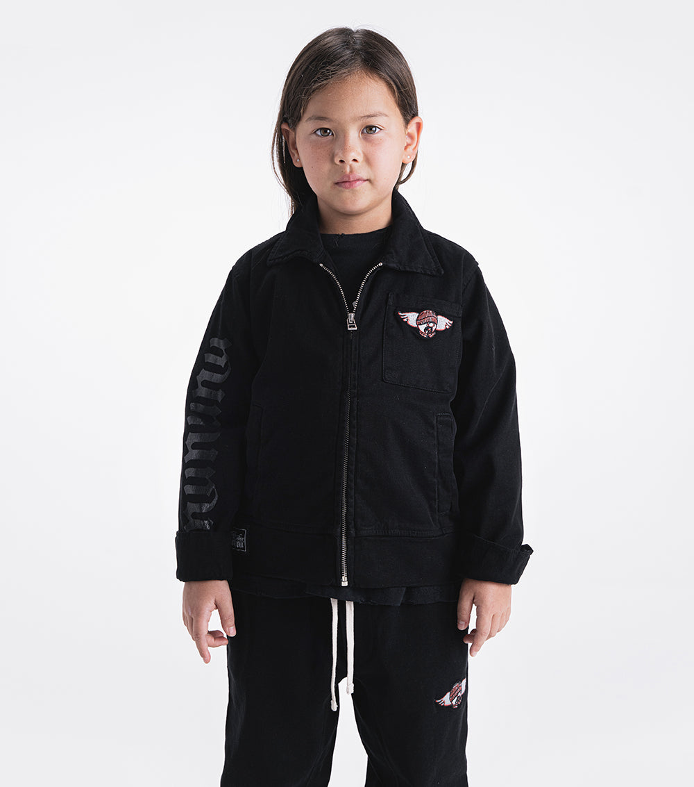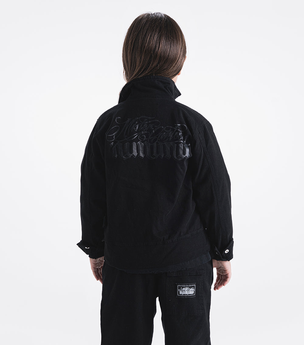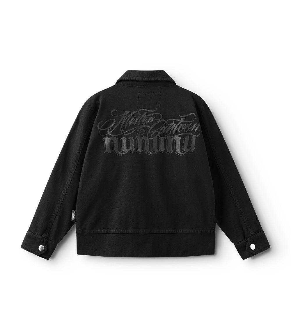 this gender-neutral black jacket is ready for anything. this piece was made in collab with super talented tattoo artist mister cartoon so of course it's got his iconic winged dude patch on the left-hand pocket making sure y'all remember your roots! peep the right sleeve with nununu on it in sleek black on black print. turn it over and see Mister Cartoon and nununu printed in ink-inspired fonts on the back in the same black on black. it’s made of durable woven fabric with a big zipper dividing two big side pockets for hiding stuff in. the sleeves have silver detail snap buttons so you can roll em up or leave them locked & loaded. it’s giving a dressed look with the collar but go on and take it fancy or make it casual. your choice, it's totally rad either way.