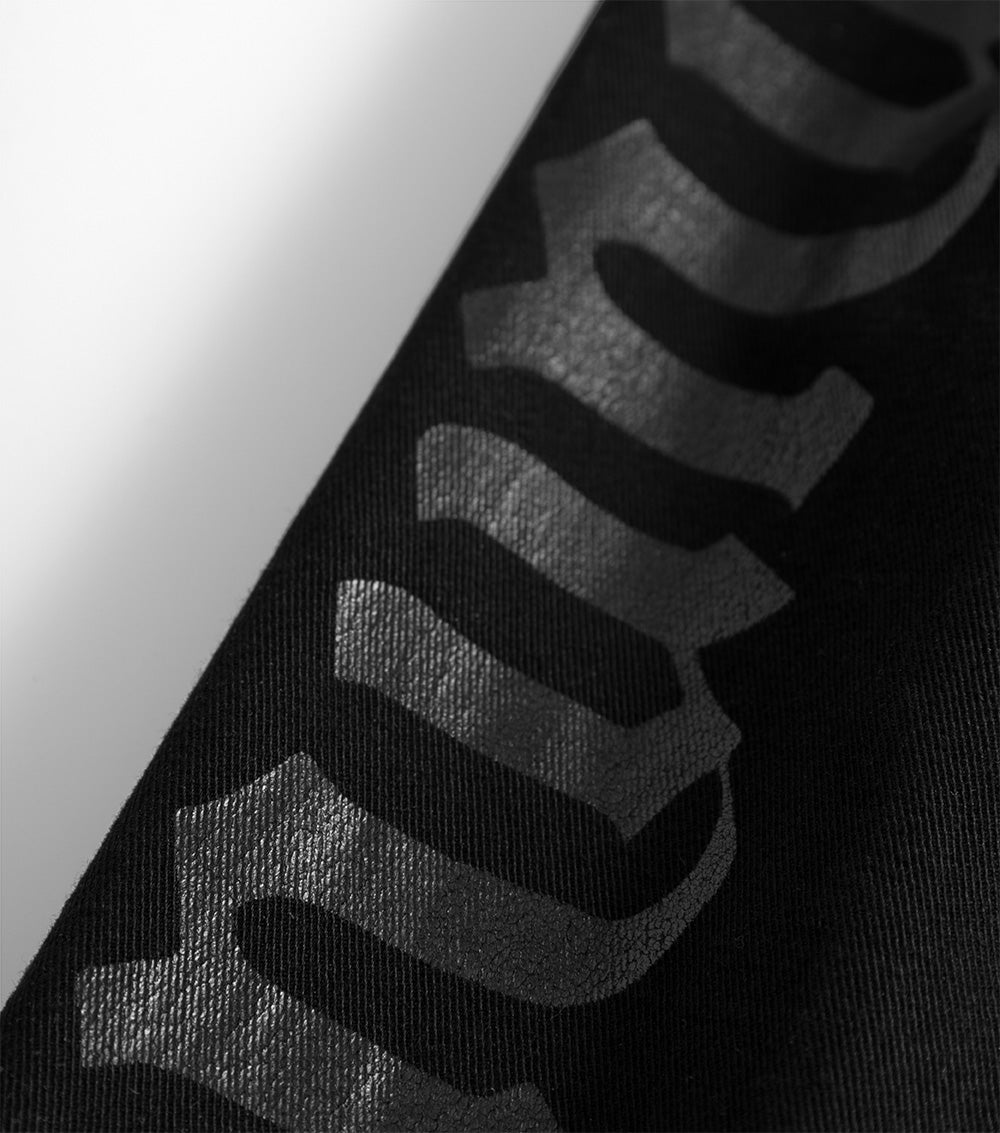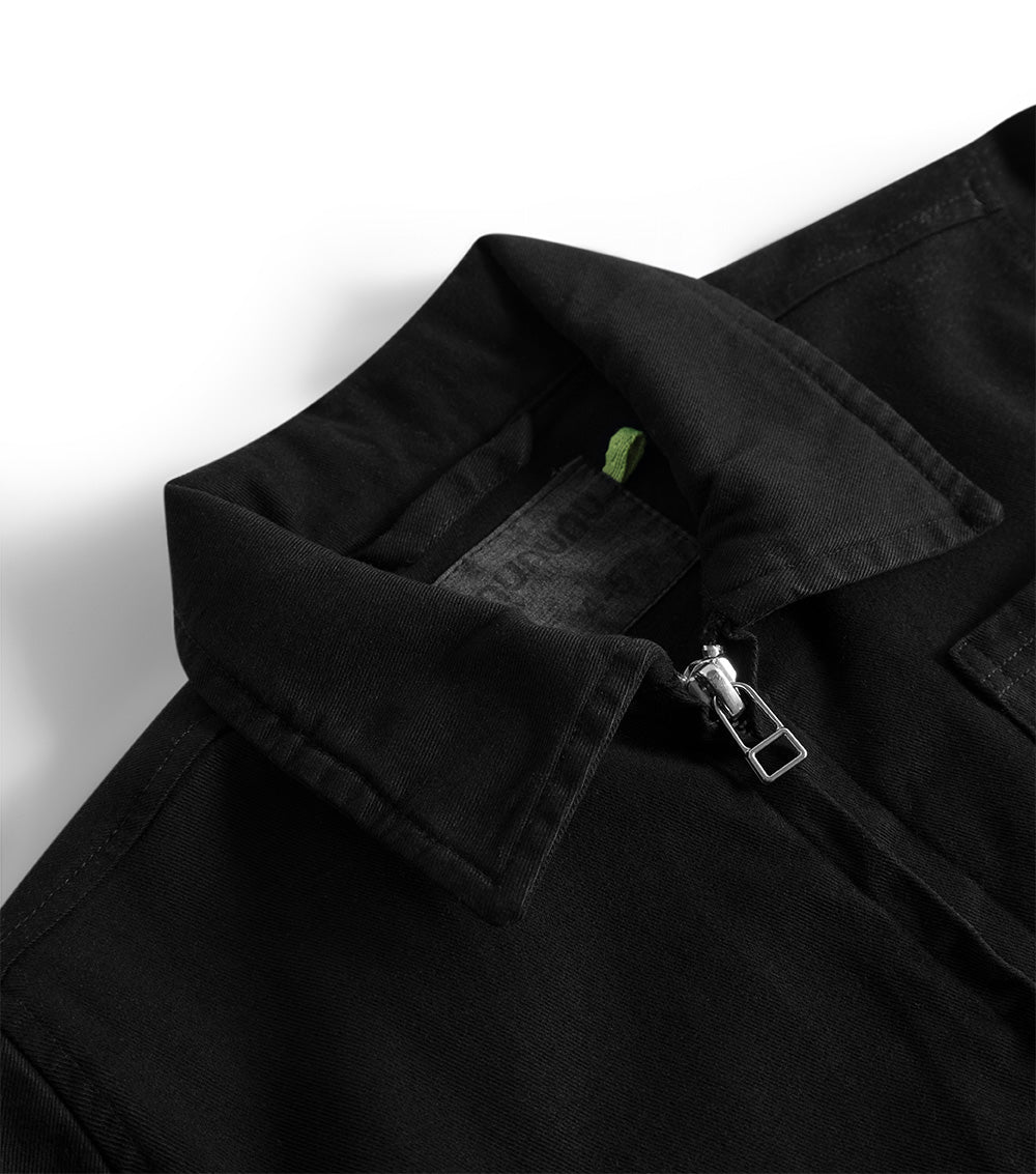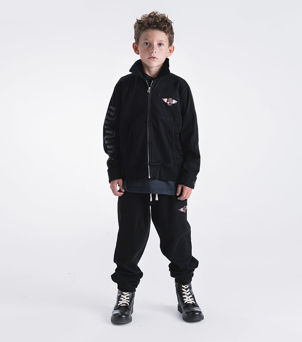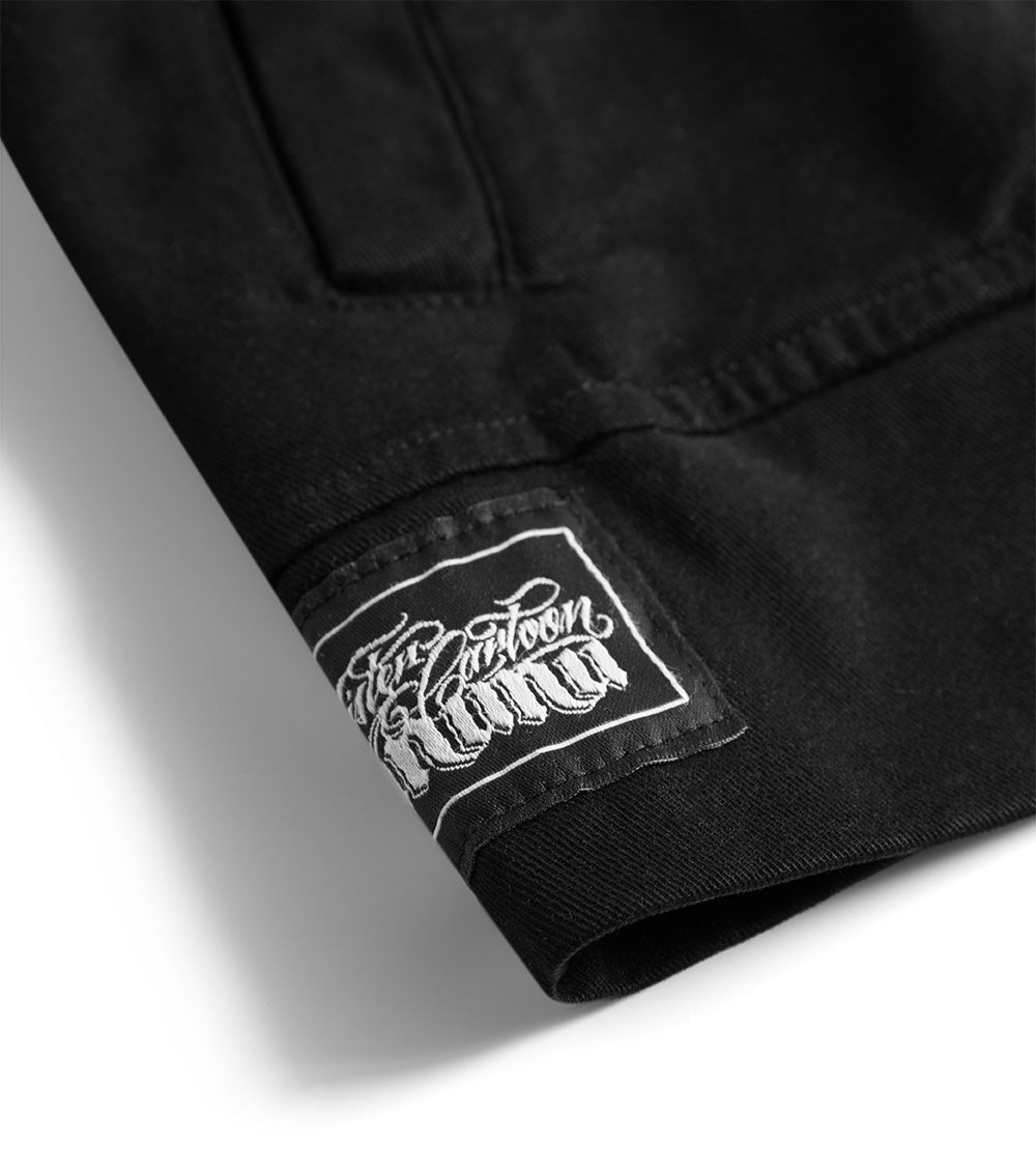 this gender-neutral black jacket is ready for anything. this piece was made in collab with super talented tattoo artist mister cartoon so of course it's got his iconic winged dude patch on the left-hand pocket making sure y'all remember your roots! peep the right sleeve with nununu on it in sleek black on black print. turn it over and see Mister Cartoon and nununu printed in ink-inspired fonts on the back in the same black on black. it’s made of durable woven fabric with a big zipper dividing two big side pockets for hiding stuff in. the sleeves have silver detail snap buttons so you can roll em up or leave them locked & loaded. it’s giving a dressed look with the collar but go on and take it fancy or make it casual. your choice, it's totally rad either way.