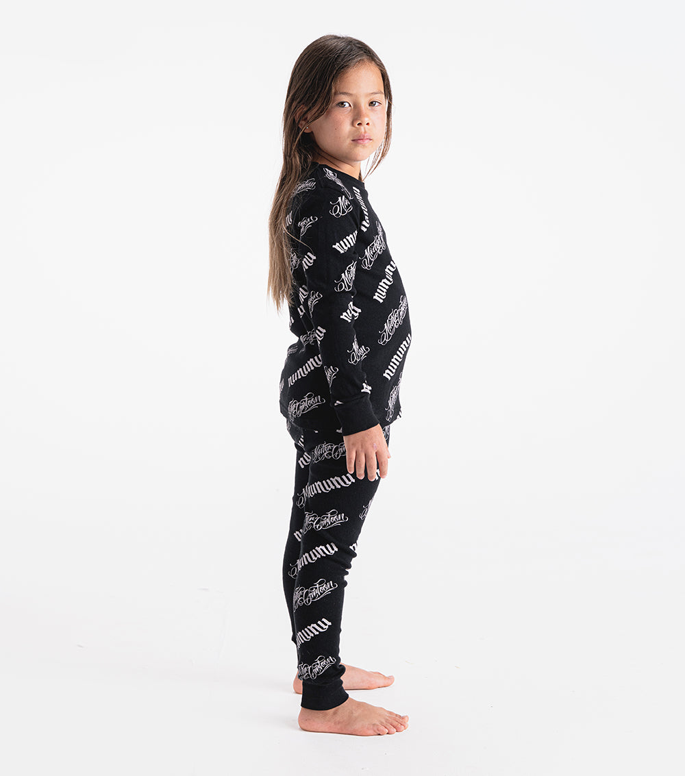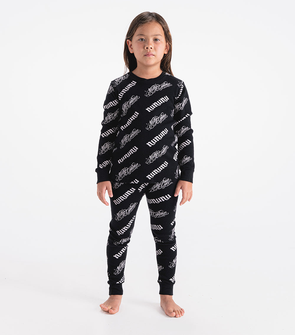 our bold new “nununu” design is inked all over this black, cozy rib loungewear set that lets boys & girls chill out in total style. it looks so dope because it’s made in collab with super talented tattoo artist mister cartoon. we can’t get over the vibe of this rad artistic rendering of our two logos. worn together or separately, this long sleeve t shirt & bottom set is perfect for stunting on everyone at the next sleepover or just making trouble around the house.