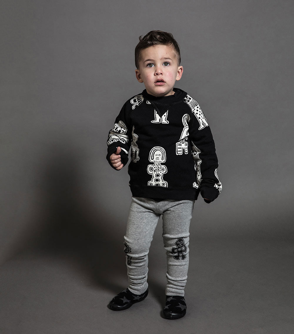 our classic heather grey leggings come in stretchy-soft nununu cotton, which makes it easy for boys & girls to play, run, and take over the world. with this pair, they bring along two friends on their adventures. we’ve got our zany tribal dancers at both knees, a design collaboration with artist Shay Id Alony.