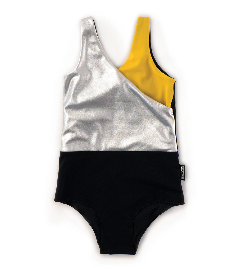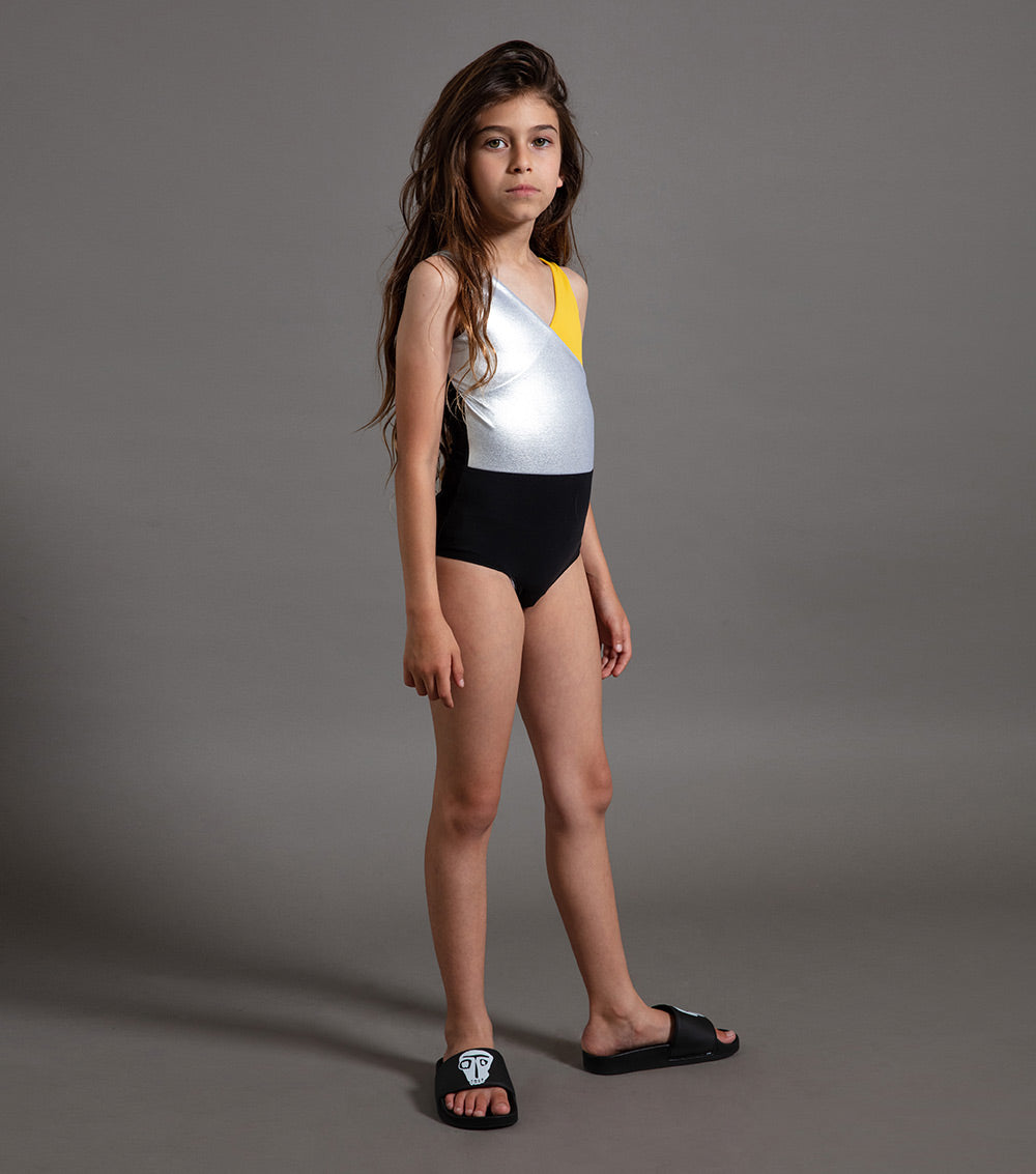 swimwear, but make it fashion. like, high fashion. studio 54 vibes are dripping from this knockout girls’ one-piece, with its colorblock surplice top, surprising silver-yellow combo & basic black bottom. besides shutting it down at the beach, you could totally do this as a top with jeans, pants or one of our wrap skirts. so many ways to work it.