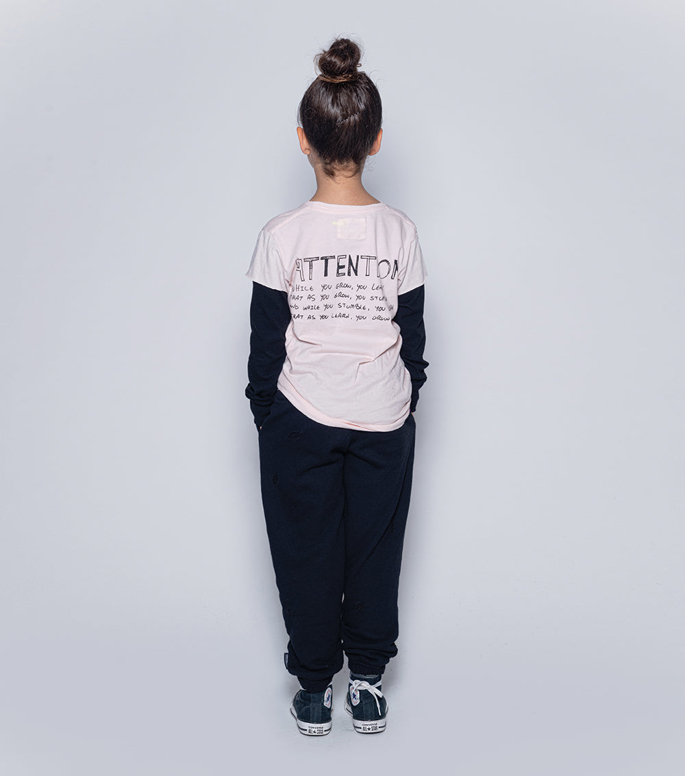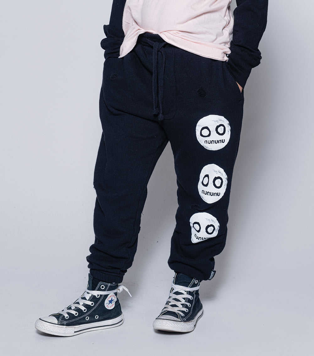 is it the man in the moon, or a funny guy with googly eyes? either way, our new take on the smiley face keeps nununu on the lips, always. it comes in a grouping of 3 down one leg of these black deconstructed sweatpants. featuring a basic relaxed cut and custom-placed holes, they cinch up with an elastic drawstring waist. the care tag is sewn cleverly on the outside, placed down near the cuff, because we don’t do things like everyone else.