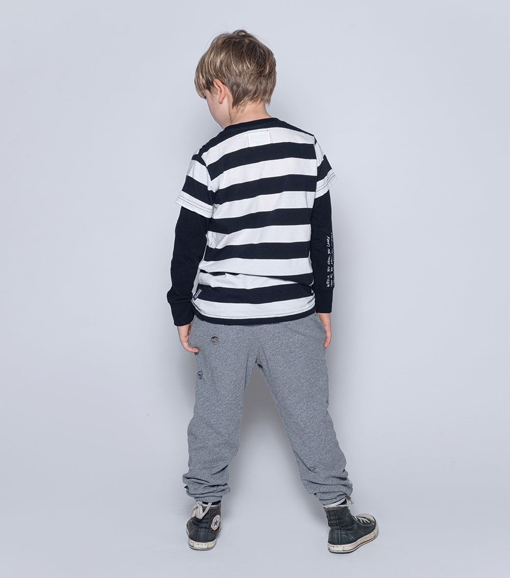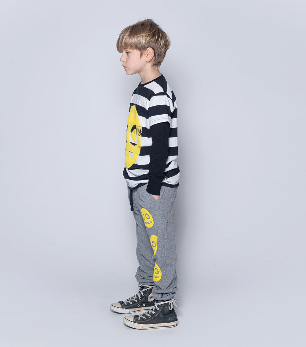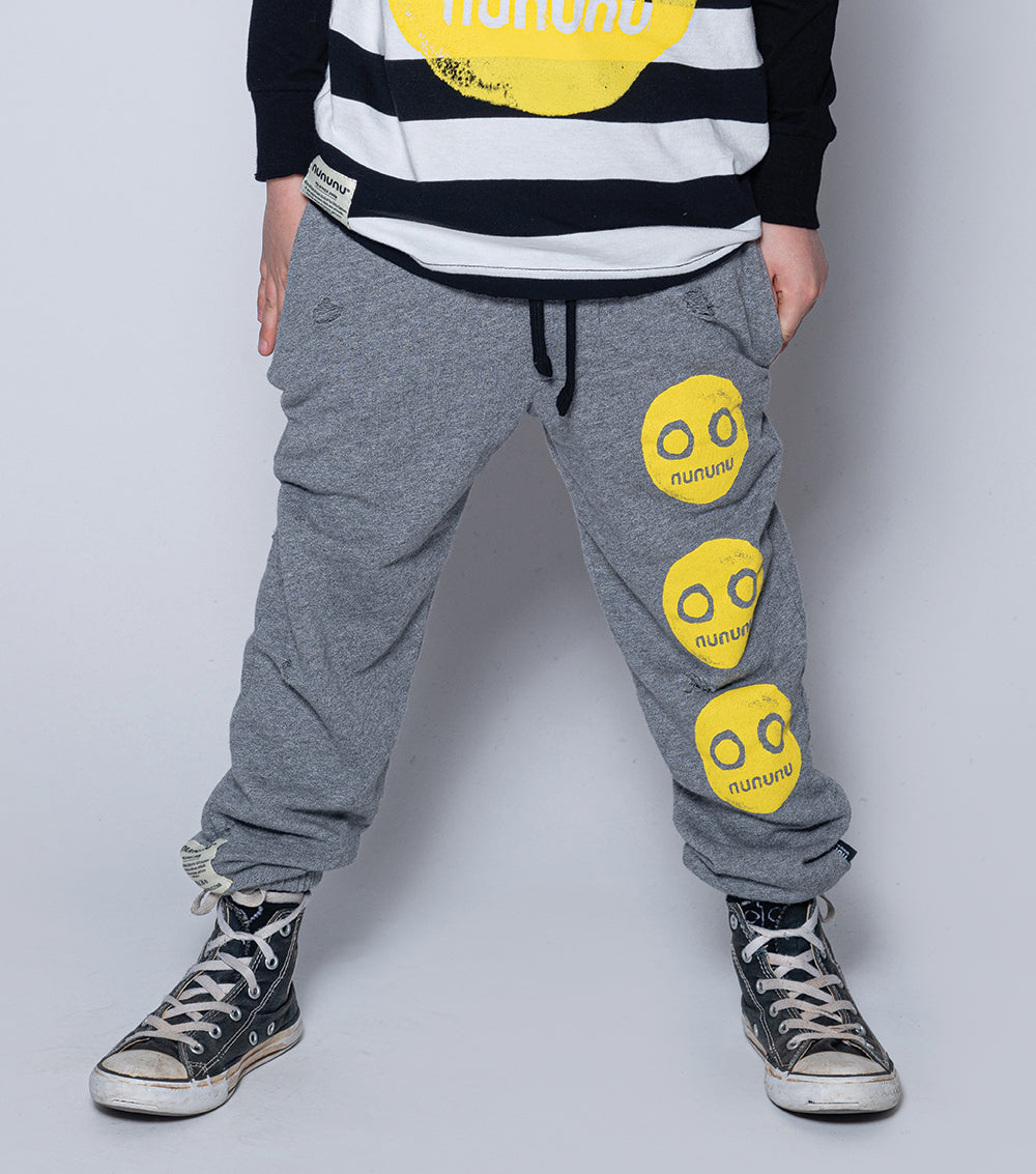 is it the man in the moon, or a funny guy with googly eyes? either way, our new take on the smiley face keeps nununu on the lips, always. it comes in a grouping of 3 down one leg of these dusty heather grey deconstructed sweatpants. featuring a basic relaxed cut and custom-placed holes, they cinch up with an elastic drawstring waist. the care tag is sewn cleverly on the outside, placed down near the cuff, because we don’t do things like everyone else.