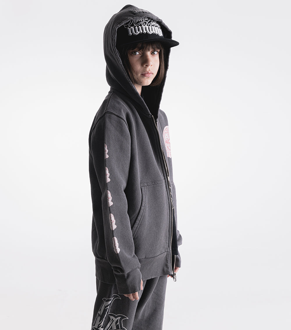 this gender neutral nununu zip hoodie was specifically designed for clowning around. your kid’s fave pastime. it's washed graphite inside and out and made with wildly soft french terry. something they def won’t want to take off. it was made in collab with super talented tattoo artist mister cartoon so of course it's got his captivating clown design painted on the front and all the way up and down both sleeves in bold white & red. wear-it-and-wash-it for that intentionally cool, worn look. oh yeah, and it’s got two big old kangaroo pockets on each side split by a full zip so your kid can stash all of the props for their next trick.