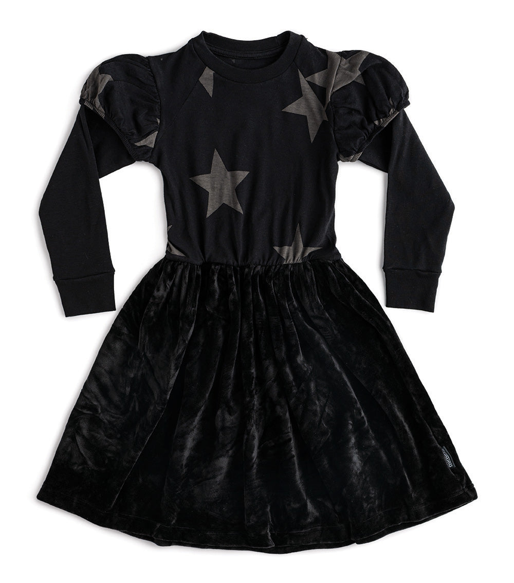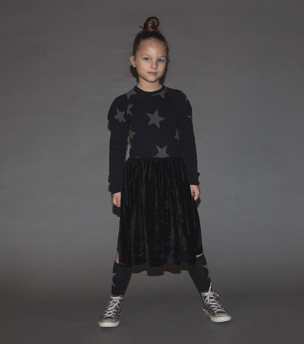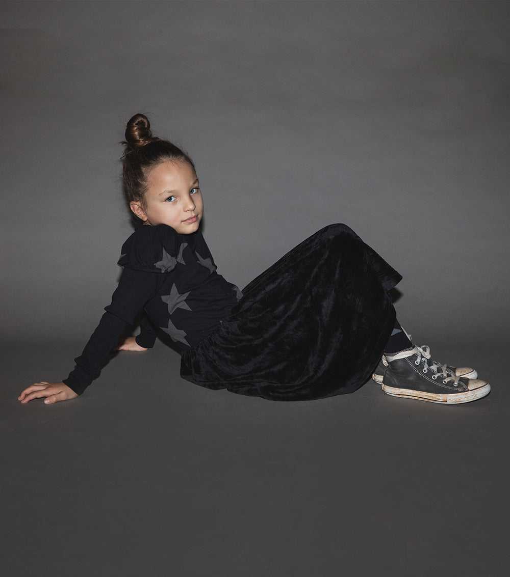 we like to make pieces that cut down on decision-making. this black velvet t-shirt dress is a total win on that front. on top, it’s soft cotton with that super-cool layered-sleeve effect & our star print. the bottom is a fabulously drapey black velvet skirt in a super cool midi length. it’s a great party look, but also goes anywhere with zero-effort style—a true no-brainer.